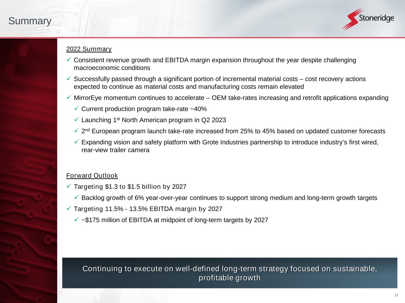 Horvath concluded, “Moving forward, we expect the impact of new program launches and expansion of existing programs to drive significant growth. We have updated our long-term revenue target to $1.3 billion to $1.5 billion by 2027 which reflects a midpoint compound annual growth rate of approximately 9.5%. This is supported by a $3.6 billion backlog which grew 6% relative to 2021. Driven by incremental contribution margins, continued margin recovery actions, favorable mix related to our aftermarket products and continued leverage on our existing cost structure, we are targeting an EBITDA margin of 11.5% to 13.5% by 2027. Stoneridge remains well positioned to significantly outperform our underlying markets and drive significant margin expansion resulting in long-term shareholder value creation.”