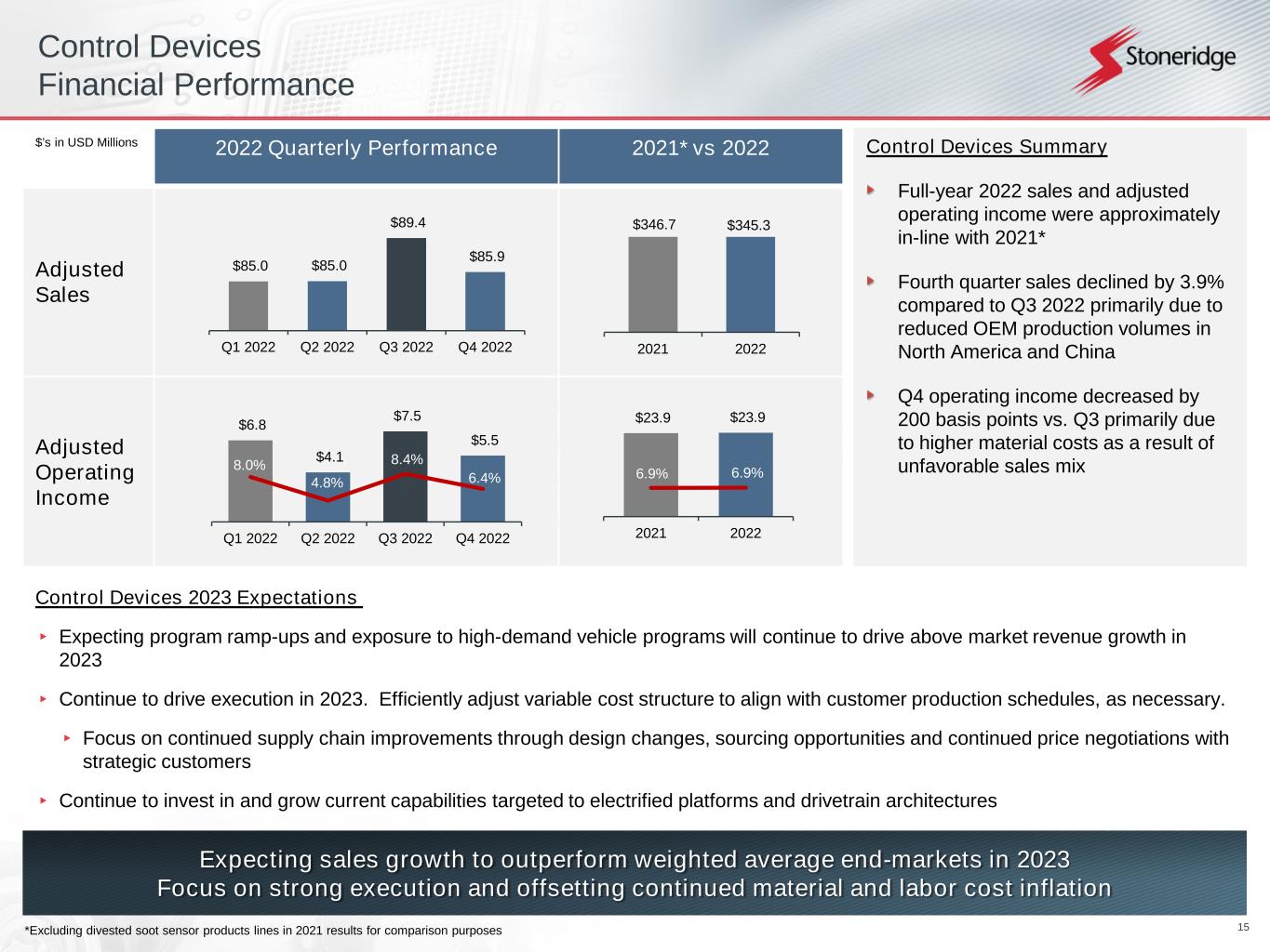 Control Devices sales totaled $85.9 million, an increase of 7.6% relative to adjusted sales excluding the impact of the divested business in the fourth quarter of 2021. This was primarily due to customer price increases and incremental revenue from new programs, as well as higher sales volumes in the North America commercial vehicle end-market. This growth was partially offset by reductions in customer production volumes in the North America passenger vehicle end-market and demand reductions resulting from COVID-19 related shutdowns in China impacting the fourth quarter of 2022. Fourth quarter operating margin was 6.4%, a 140 basis point improvement relative to adjusted operating margin, excluding the divested soot sensor business, in the fourth quarter of 2021, primarily due to lower SG&A costs.