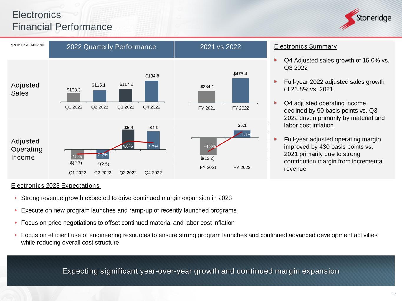 Relative to the third quarter of 2022, Electronics adjusted sales increased 15.0%, primarily due to higher sales volumes in the European commercial vehicle and off-highway end-markets, expansion of recently launched programs and pricing actions. This growth was partially offset by an unfavorable foreign currency impact of $1.5 million. Fourth quarter operating margin decreased 90 basis points relative to the third quarter of 2022, primarily due to higher material and labor costs partially offset by the favorable foreign currency impact of approximately $1.2 million, reduced SG&A spend and fixed cost leverage on incremental sales.
