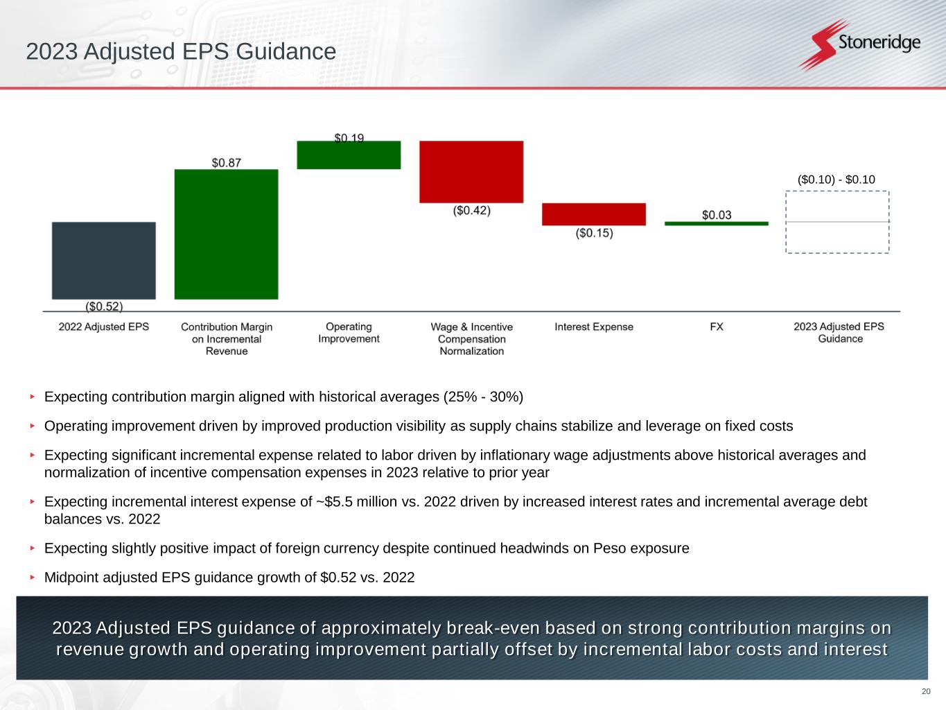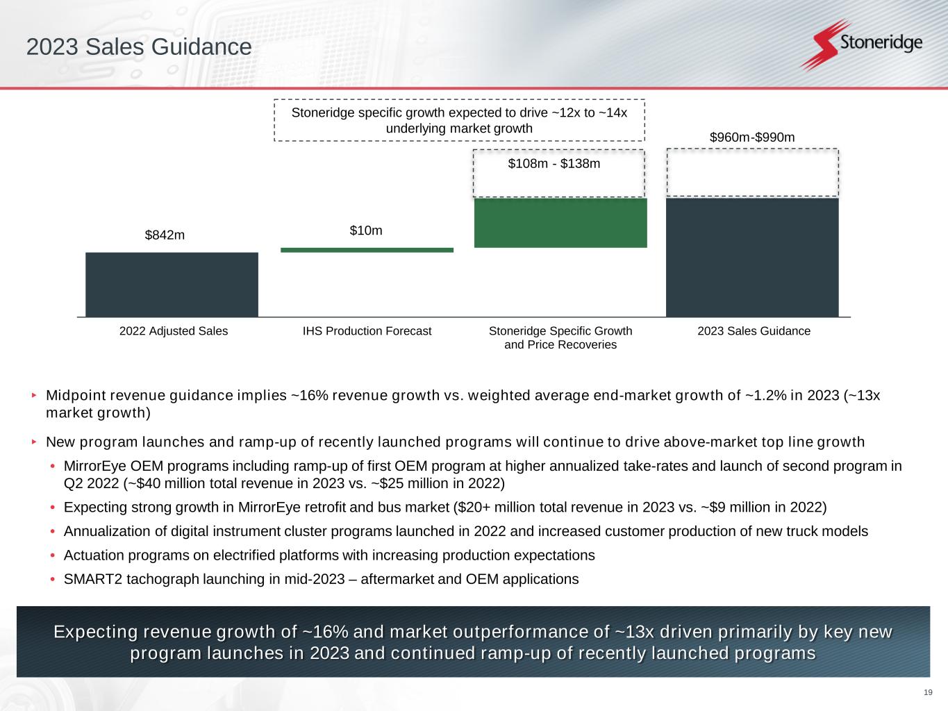 Zizelman commented, “MirrorEye has continued to accelerate and will start to deliver significant results for the Company during 2023. Despite a continued challenging macroeconomic environment, over the past several years we invested tens of millions of dollars to develop MirrorEye, a truly industry-changing technology. Our first OEM MirrorEye program continues to outperform original expectations with a take-rate of approximately 40% compared to the original customer communicated take-rate of 16%. Our next MirrorEye program launches in North America in the second quarter of this year and based on the momentum we are seeing for the first OEM program, we believe there is upside to the take-rate assumption in 2023. Our second European OEM partner, with a program launching in 2024, recently increased their forecasted take-rate from 25% to approximately 45% based on expected market demand. We are also seeing continued growth in our retrofit market for MirrorEye in North America. As an example, earlier this week, we announced a partnership with KLLM Transport and Frozen Food Express, outlining their intent to include MirrorEye on 1,000 of their new and existing vehicles. This is just one example of the many fleets Stoneridge continues to work with to expand MirrorEye in North America. We have a number of reasons why we believe that our MirrorEye technology will expand much further in the industry. For instance, we also just announced a partnership with Grote Industries to bring our innovative camera technology to the commercial vehicle trailer market.