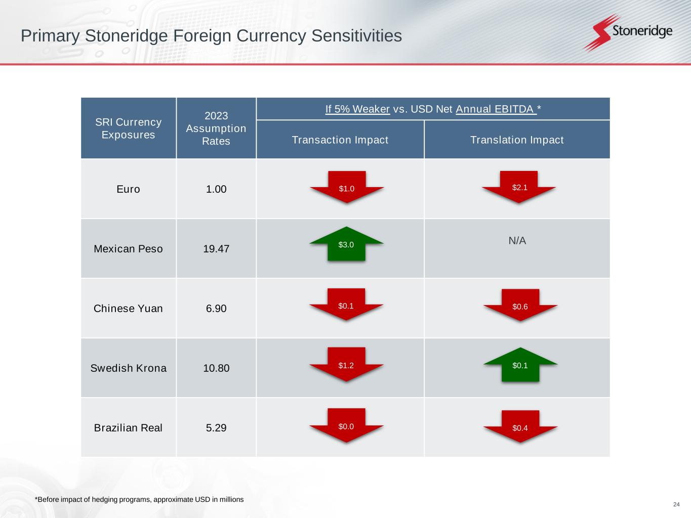 Stoneridge Brazil sales were $13.1 million, a decrease of 6.7% relative to sales in the fourth quarter of 2021, primarily due to lower sales in most product lines offset by favorable foreign currency translation of $0.9 million. Fourth quarter adjusted operating margin was 6.0%, an improvement of 350 basis points, primarily due to favorable product mix.
