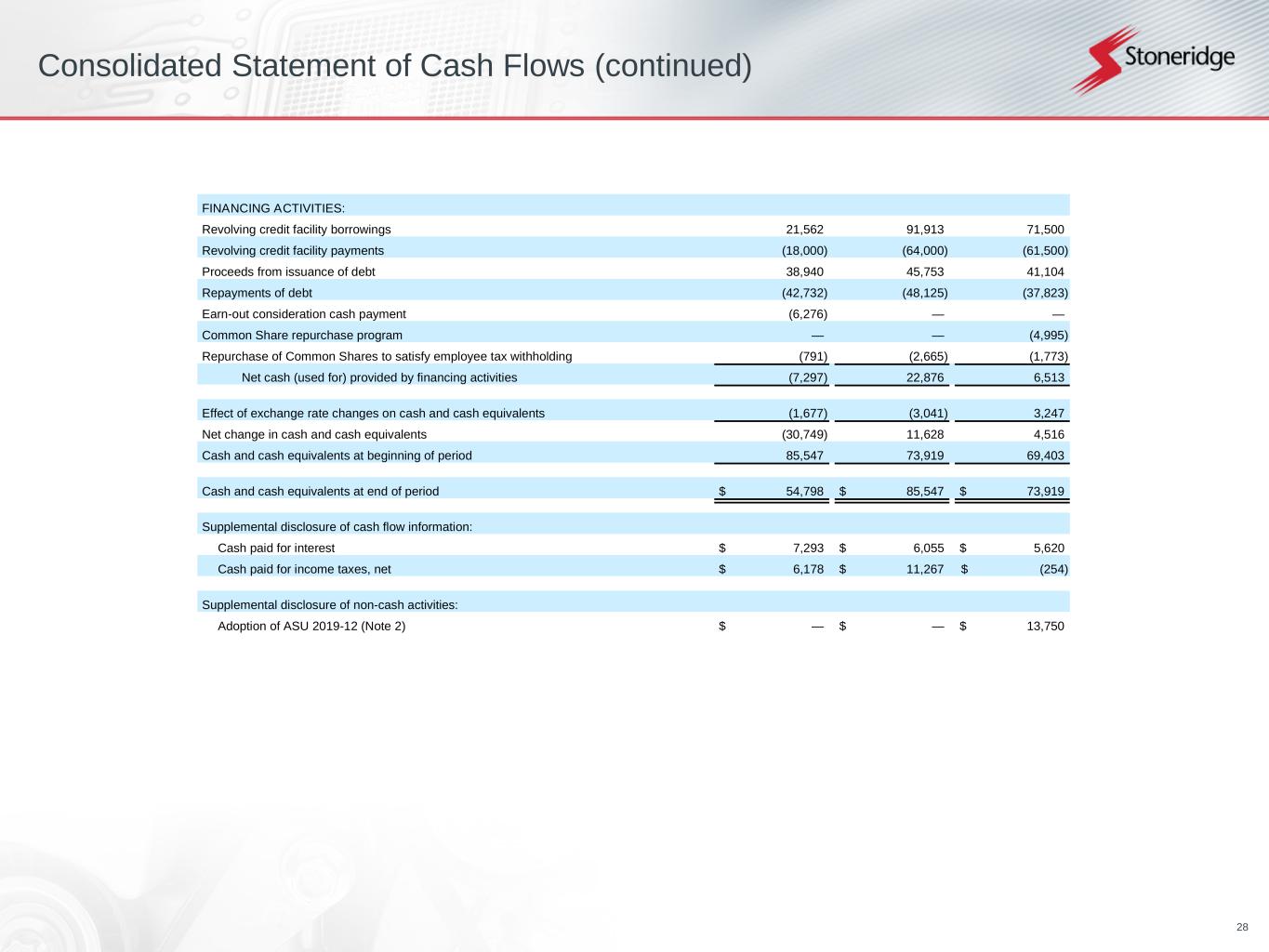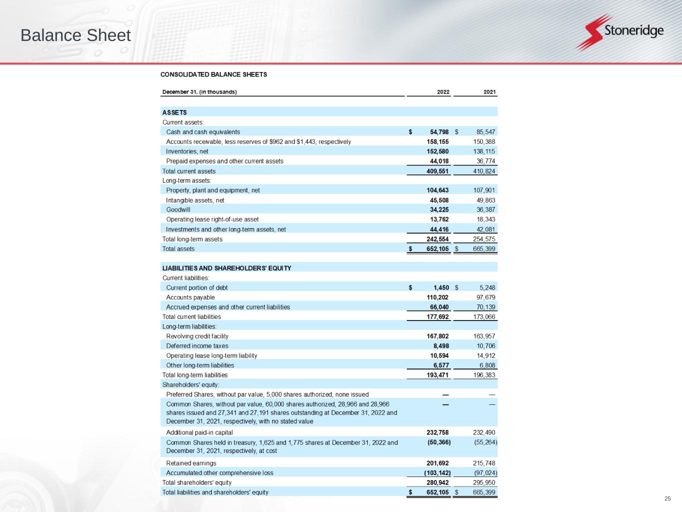 As of December 31, 2022, Stoneridge had cash and cash equivalents balances totaling $54.8 million. Total debt as of December 31, 2022 was $169.3 million. Net debt was reduced by $21.7 million in the fourth quarter to $114.5 million as of December 31, 2022.