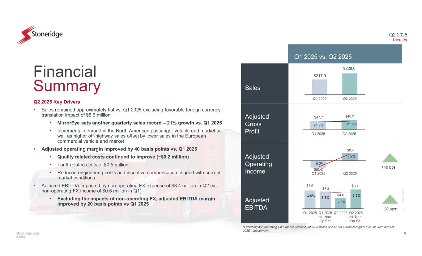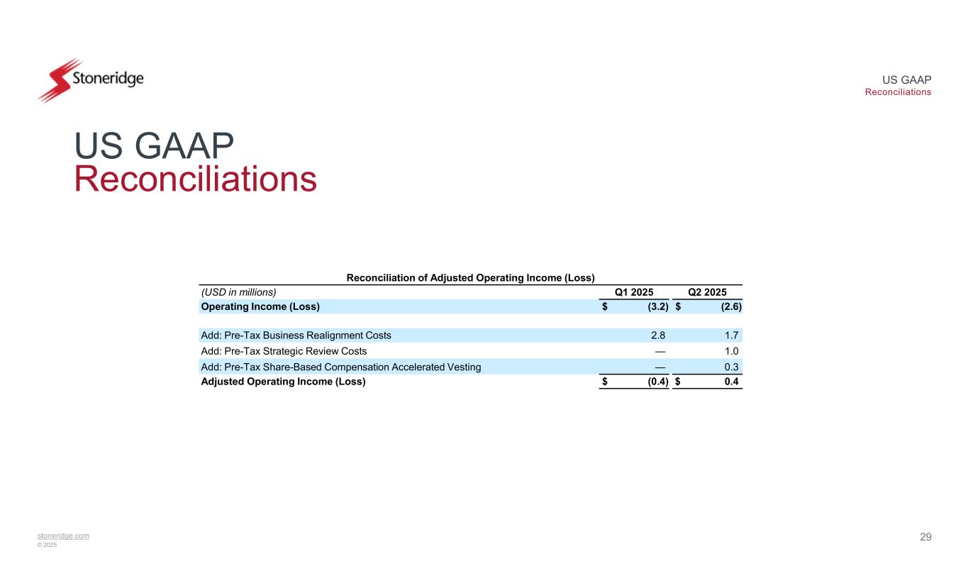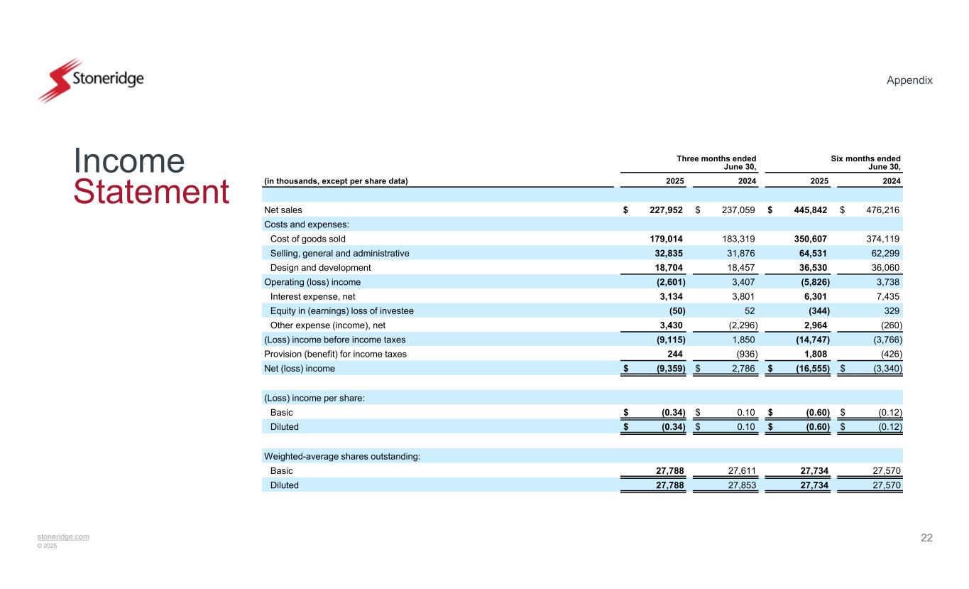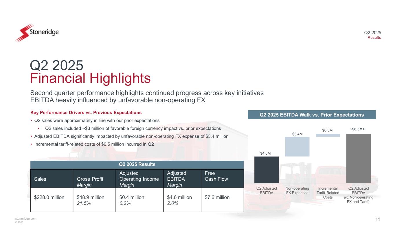 ミシガン州ノビ-2025年8月6日-ストーネリッジ・インク(NYSE: SRI)は本日、2025年6月30日を期末とする第2四半期の業績を発表した。第2四半期の売上高は2億2,800万ドル、売上総利益は4,890万ドル(売上高の21.5%)であった。営業損失は260万ドル(対売上高比1.1%)、調整後営業利益は040万ドル(対売上高比0.2%)であった。純損失は940万ドル、調整後純損失は700万ドル。1株当たり損失(EPS)は△0.34ドル、調整後EPSは△0.25ドル。調整後EBITDAは460万ドル(売上高比2.0%)で、これには340万ドルの営業外為替費用が含まれている。