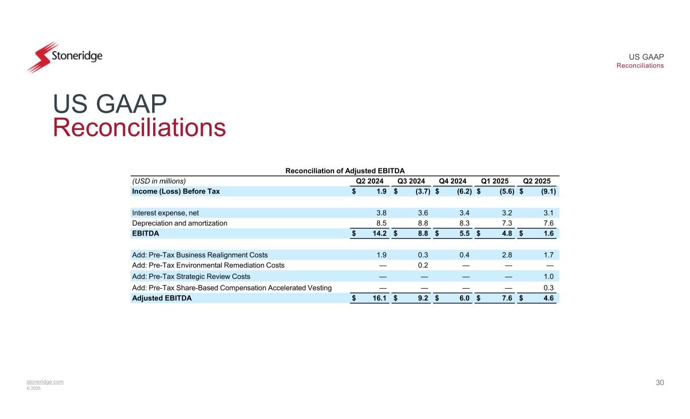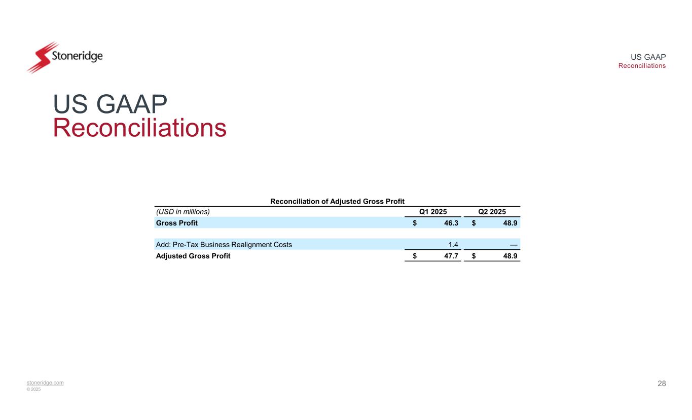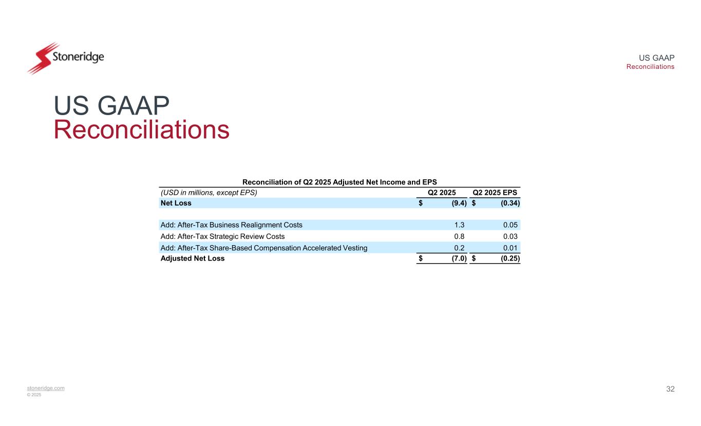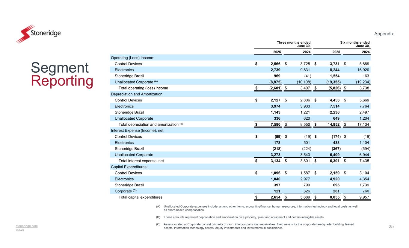 ミシガン州ノビ-2025年8月6日-ストーネリッジ・インク(NYSE: SRI)は本日、2025年6月30日を期末とする第2四半期の業績を発表した。第2四半期の売上高は2億2,800万ドル、売上総利益は4,890万ドル(売上高の21.5%)であった。営業損失は260万ドル(対売上高比1.1%)、調整後営業利益は040万ドル(対売上高比0.2%)であった。純損失は940万ドル、調整後純損失は700万ドル。1株当たり損失(EPS)は△0.34ドル、調整後EPSは△0.25ドル。調整後EBITDAは460万ドル(売上高比2.0%)で、これには340万ドルの営業外為替費用が含まれている。