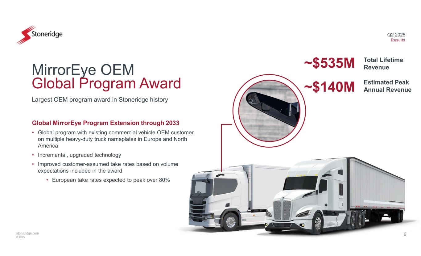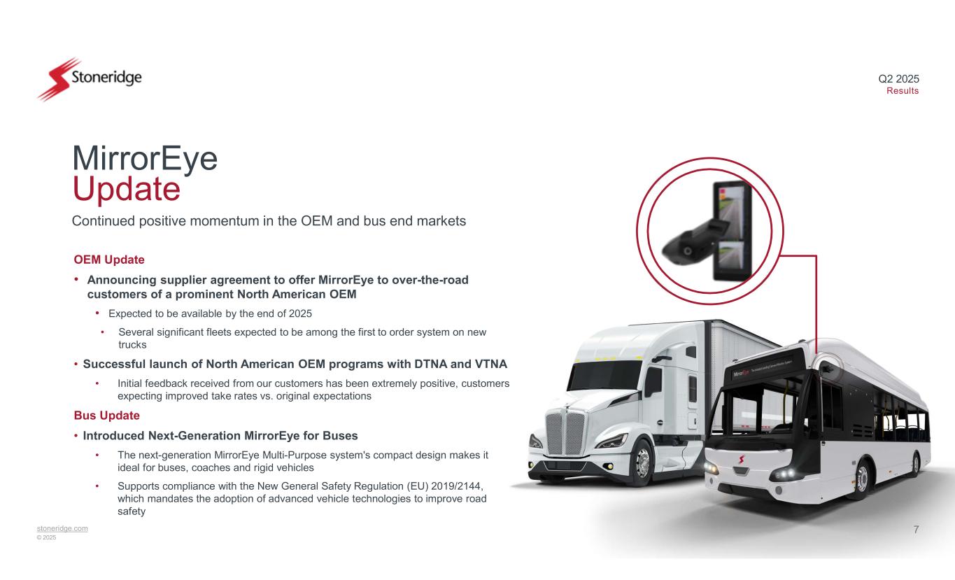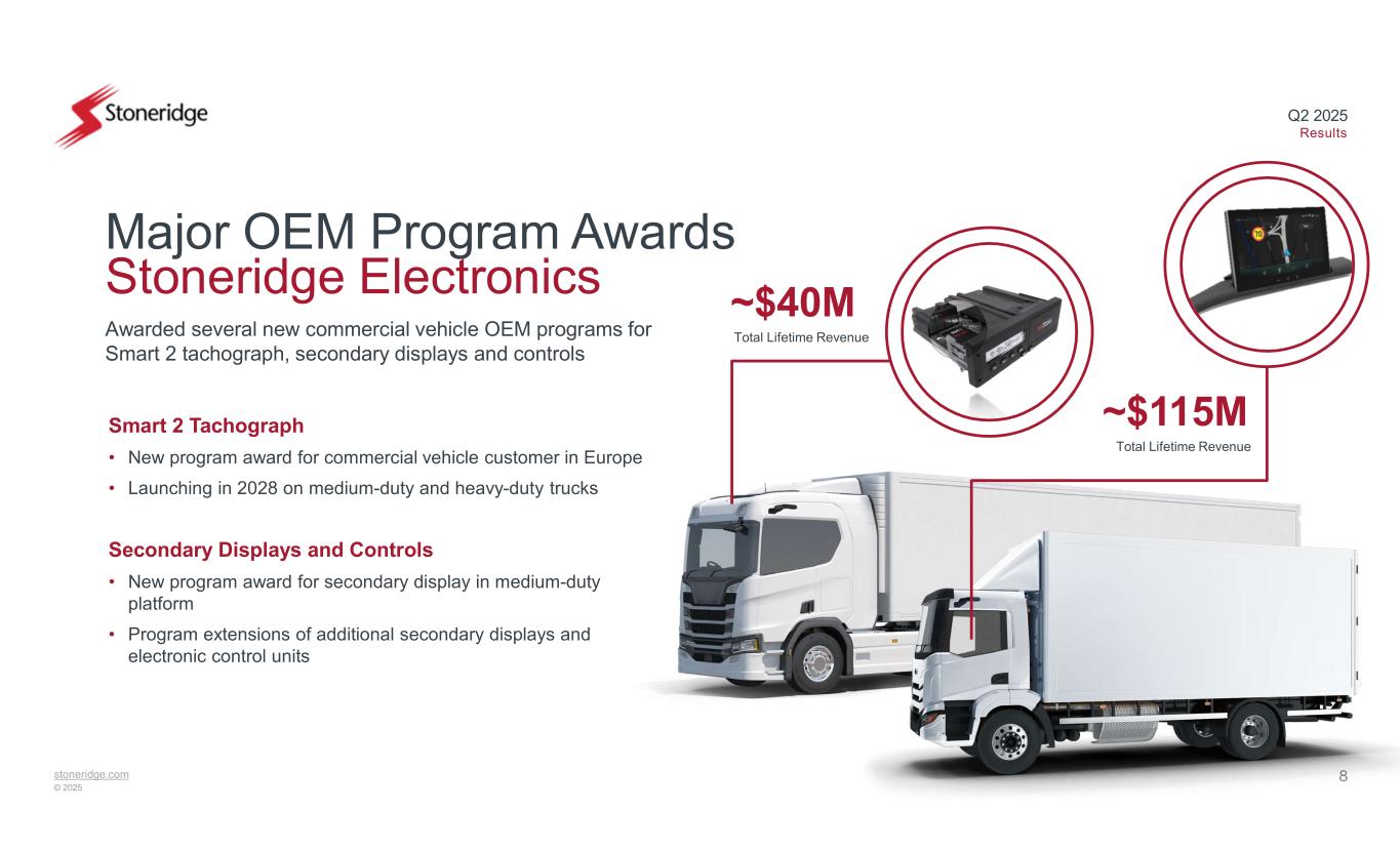 また本日、エレクトロニクス部門とストーネリッジ・ブラジル部門の双方において、生涯売上高で合計約7億7,500万ドルにのぼる複数の重要な新規プログラム受注を発表した。このうち、Stoneridge史上最大規模のMirrorEyeプログラム延長は、生涯売上高約5億3500万ドル、ピーク時の年間売上高約1億4000万ドルと見積もられています。また、今期はSmart 2次世代タコグラフの新たなOEMプログラム、セカンダリーディスプレイと電子制御ユニットの複数のプログラムも受注しており、これら合計で推定生涯売上高1億5,500万ドルの追加貢献が見込まれている。最後に、ストーネリッジ・ブラジルは、顧客のインフォテインメント・プログラム向け電子制御ユニットで、このセグメント史上最大のOEMプログラムを受注した。この新規事業の生涯売上高は約8,500万ドルで、ピーク時の年間売上高は約2,000万ドルに上ると推定される。