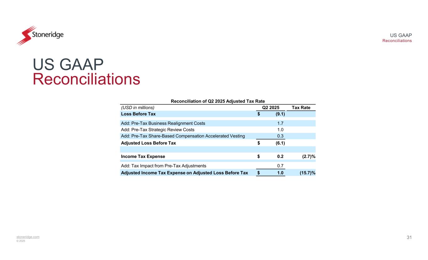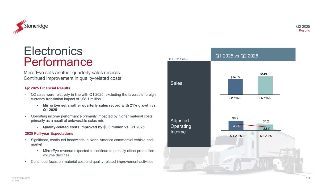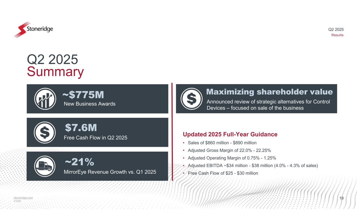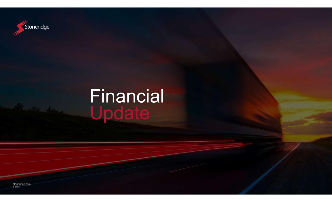 ホーバスは最後に、「我々は引き続き、優れた先端技術ポートフォリオを活用し、継続的な収益拡大のための強固な基盤を構築することに注力していく。関税を含むマクロ経済政策の変化と当社事業への影響を引き続き注視し、これまでと同様、コスト増を相殺するために迅速に対応していきます。今四半期の新規事業受賞の発表で示されたように、Stoneridgeは当社の基礎となる市場を凌駕し、長期的な株主価値創造につながる利益拡大を推進するための好位置にとどまっています。"
