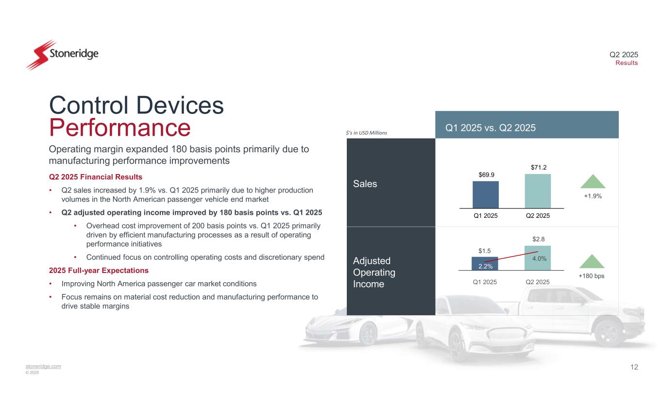 コントロール・デバイスの第 2 四半期売上高は、北米乗用車市場向け生産台数の増加に牽引され、 前年同期比 1.9%増の 7,120 万ドルとなった。第 2 四半期の調整後営業利益率は 4.0%となり、2025 年第 1 四半期比で 180bp 上昇しましたが、これは主に売上高の増加、諸経費の改善、研究開発費の減少によるものです。