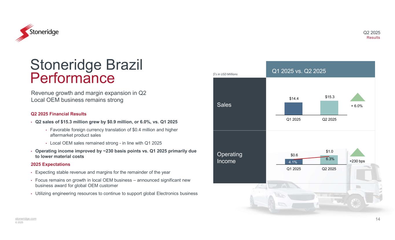 2024年第2四半期との比較では、Stoneridgeブラジル第2四半期の売上高は340万ドル(28.9%)増加した。この増加は主にOEM製品の売上増加によるもので、為替換算による不利な影響0.9百万ドルで一部相殺されました。第2四半期の営業利益は100万ドルで、売上高増加の寄与により前年同期比で約100万ドル増加しました。