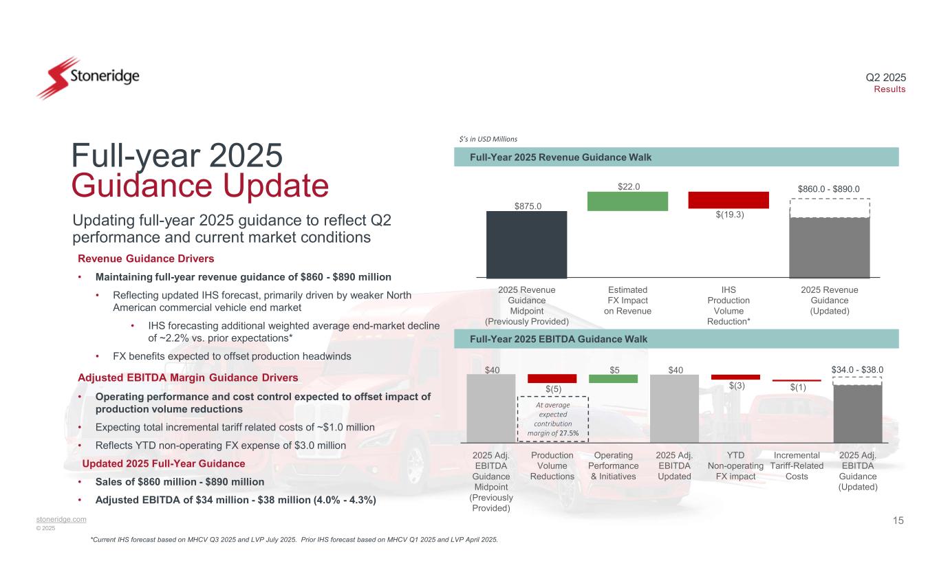 主に北米の商用車最終市場における生産台数の逆風が、有利な為替効果によって相殺される見込みであるため、2025年通期の売上高ガイダンスを維持する。好調な業績と営業費用の削減により、予想される生産台数の逆風をほぼ相殺できると考えています。調整後EBITDAガイダンスを3,400万ドルから3,800万ドル(中間値で400万ドルの減額)に更新していますが、これは上半期に認識された営業外為替による逆風300万ドルと現在の関税政策に基づく関税関連費用約100万ドルを反映したものです。最後に、在庫の継続的な削減と資本支出の慎重な管理により、引き続き強力なキャッシュ・パフォーマンスに努めており、通年のフリー・キャッシュ・フローは2,500万ドルから3,000万ドルというガイダンスを維持しています。