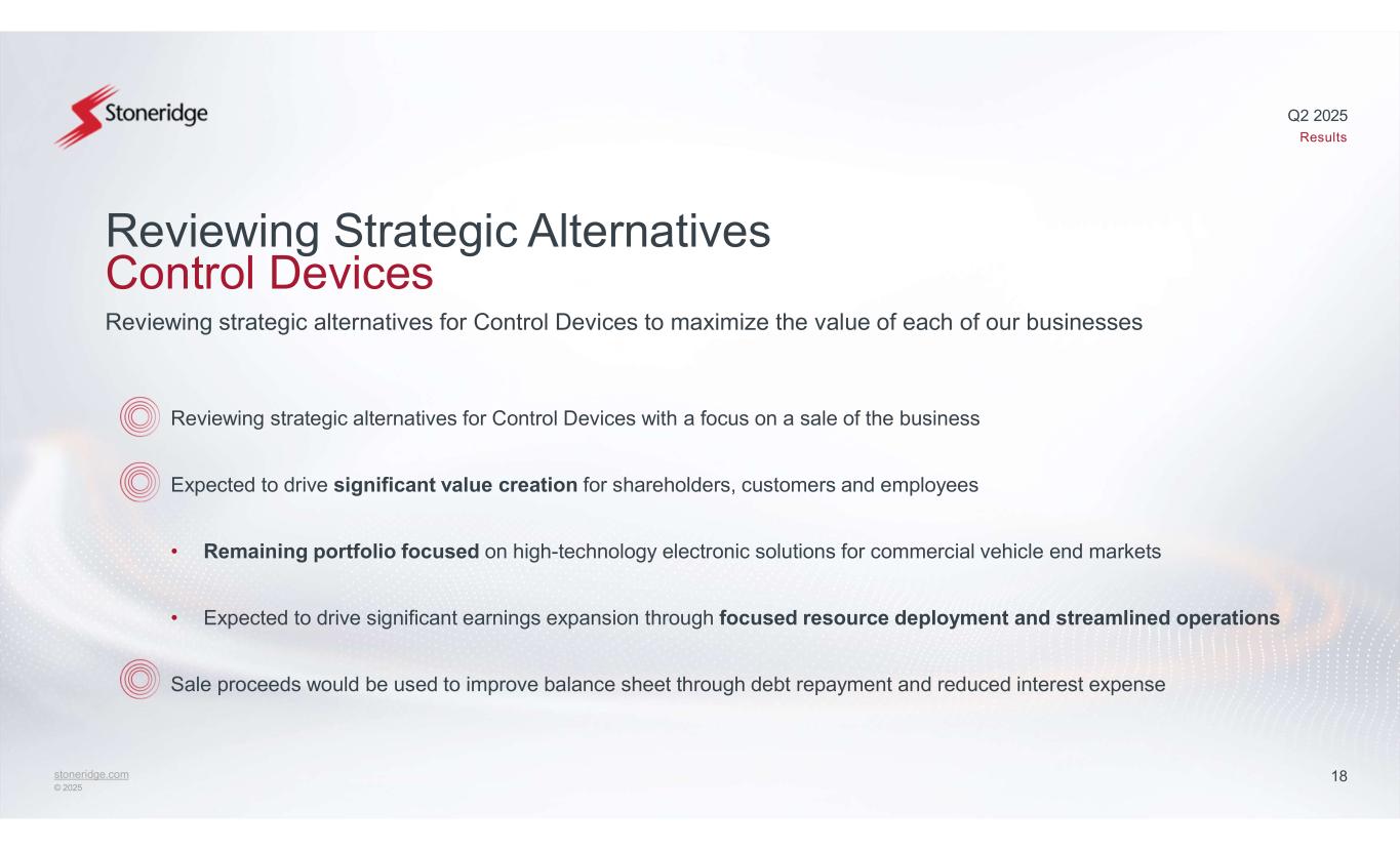 StoneridgeのCEO在任中、一貫して述べてきたように、当社の経営陣と取締役会は、株主、従業員、顧客のために価値を創造することに焦点を当て続けています。当社の事業が進化し成長し続けるなか、各事業部門がその潜在能力を最大限に発揮するために必要な資源と集中力の両方を確保する必要があります。とはいえ、エレクトロニクスとストーネリッジ・ブラジルの両分野において、当社の中核的な成長プラットフォームのいくつかで記録的な事業獲得が見られており、これらの成長プラットフォームをサポートし加速させるためには、資本、エンジニアリング・リソース、およびリーダーシップの焦点を適切に配分する必要があります。その結果、当社の長期戦略における次のステップは、制御機器部門に関連する戦略的選択肢を検討することであり、株主価値を最大化するために同部門を売却する可能性に主眼を置いています。