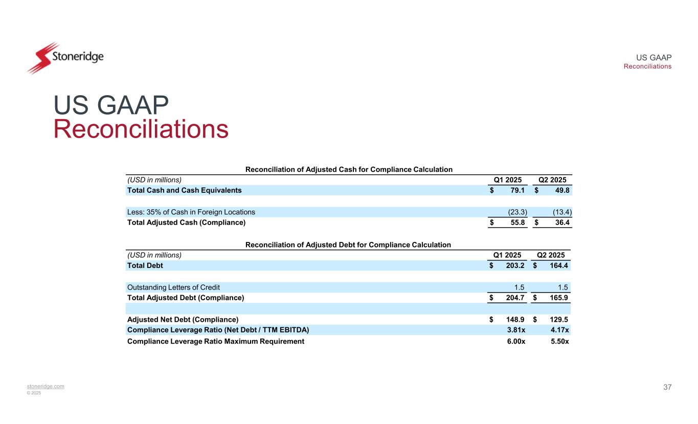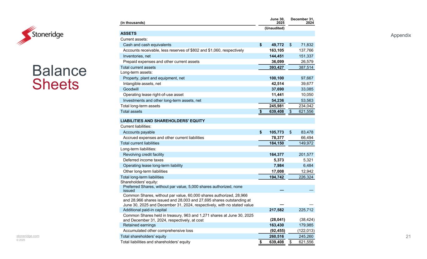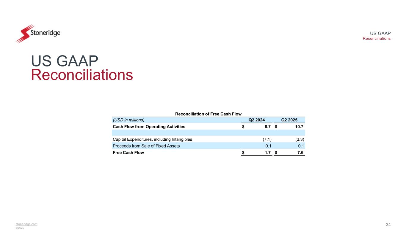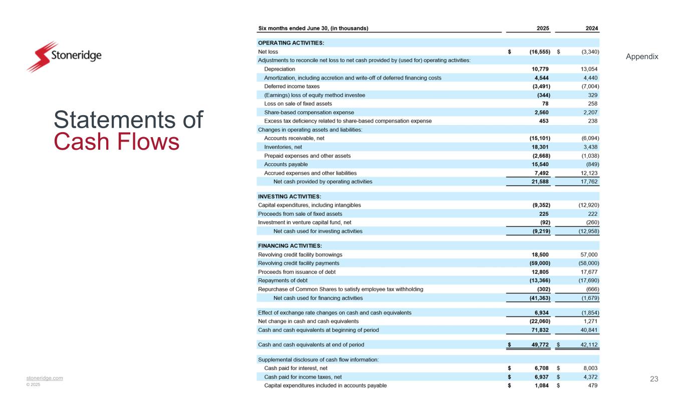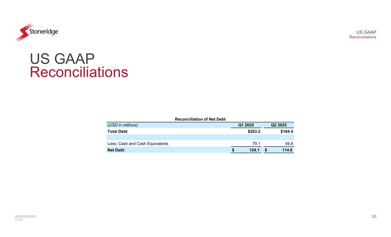 2025年6月30日現在、ストーネリッジの現金および現金同等物は4,980万ドル、負債総額は1億6,440万ドルである。2025年第2四半期には、営業活動による純現金が1,070万ドル、フリーキャッシュフローが760万ドルとなり、2024年第2四半期と比較してそれぞれ200万ドル、590万ドル増加した。また、主に4,380万ドルの世界的な現金本国送金プログラムと730万ドルの在庫削減により、負債総額と純負債は第1四半期比でそれぞれ3,880万ドルと950万ドル減少しました。