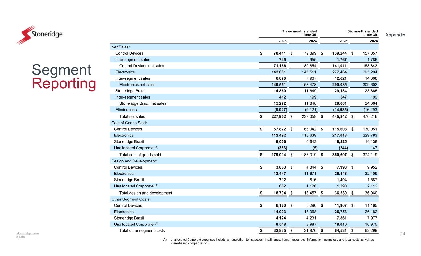 Stoneridgeは本日、制御機器事業の戦略的代替案の検討についても発表した。