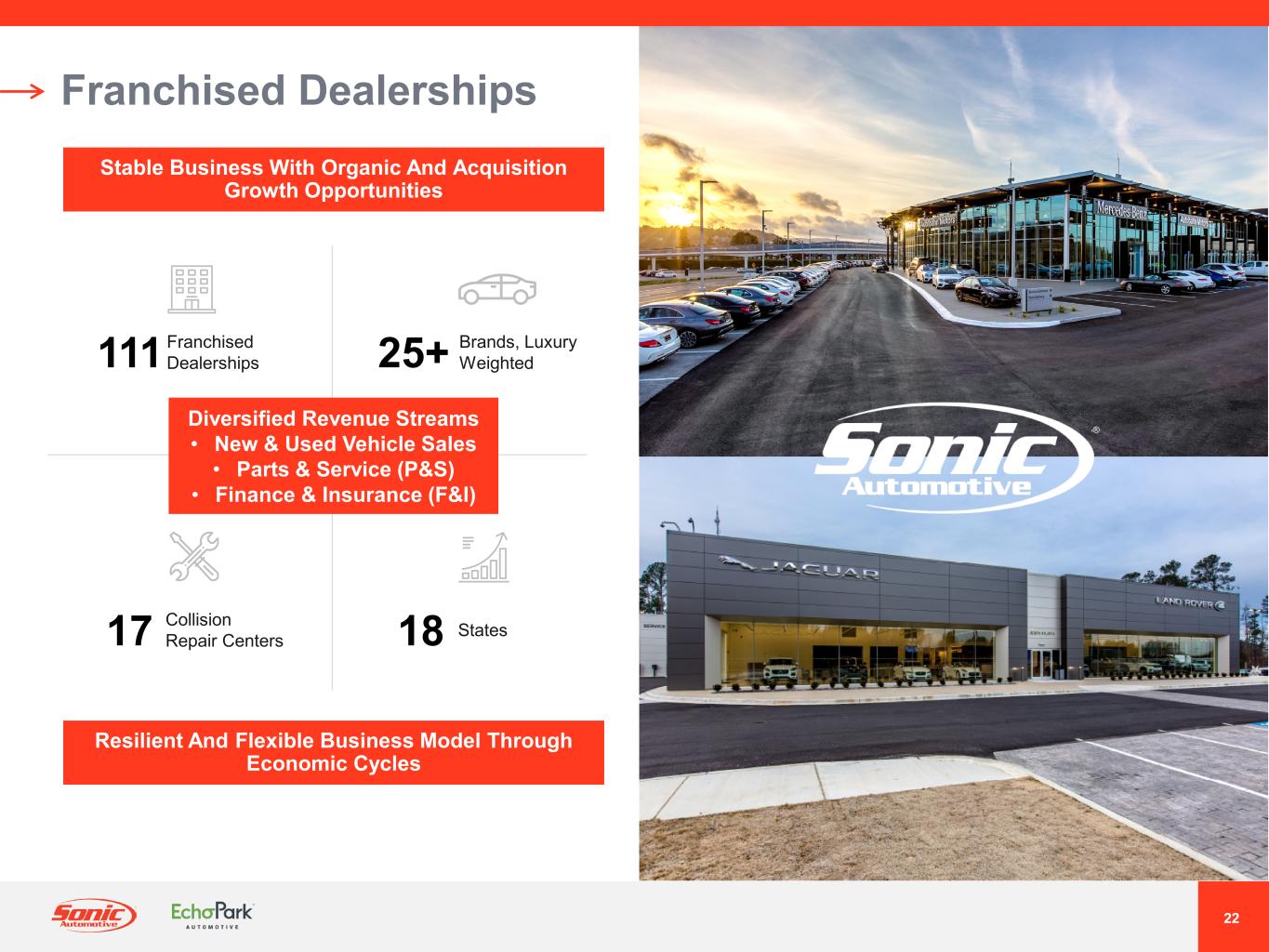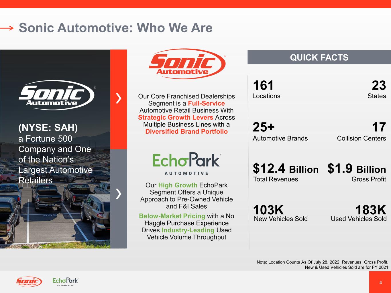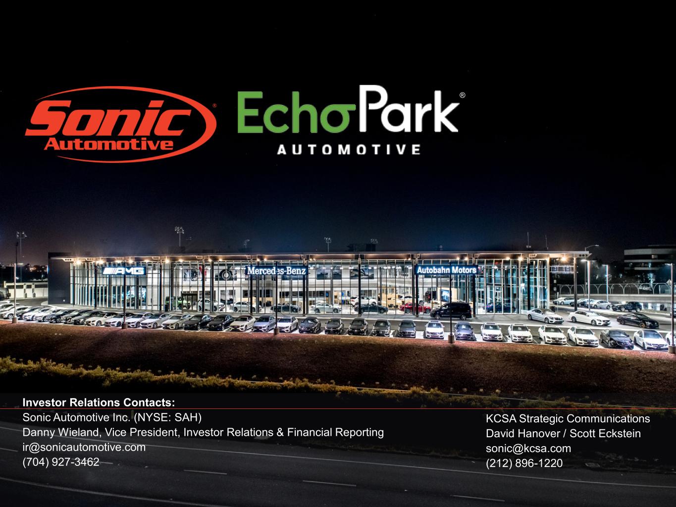 Sonic Automotive, Inc.は、ノースカロライナ州シャーロットに本社を置くフォーチュン500の企業であり、アメリカで最も価値のある自動車小売・サービスブランドになることを目指し、日々邁進しています。当社の企業文化は、テクノロジー、チームメイト、アイデアへの戦略的投資によって、業界をリードする顧客体験を創造、革新、提供することで発展し、最終的には所有者の夢をかなえ、生活を豊かにし、顧客とチームメイトに幸せをお届けします。アメリカ最大の自動車小売業者のひとつとして、私たちはこの目標を実現するために、このカテゴリーのリーダーとなるべく、飛躍的な成長を追求し、進歩的な手段を講じることを約束します。私たちの新しいプラットフォーム、プログラム、そして人材が、次世代の自動車体験の原動力となるのです。ソニック・オートモーティブの詳細については、www.sonicautomotive.com および ir.sonicautomotive.com でご覧いただけます。