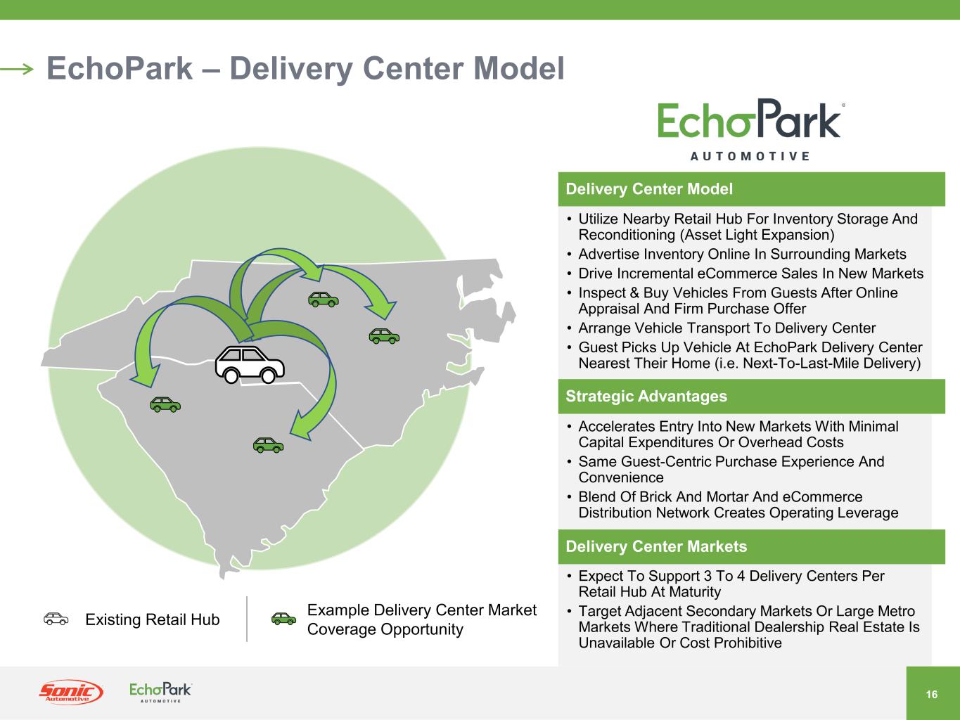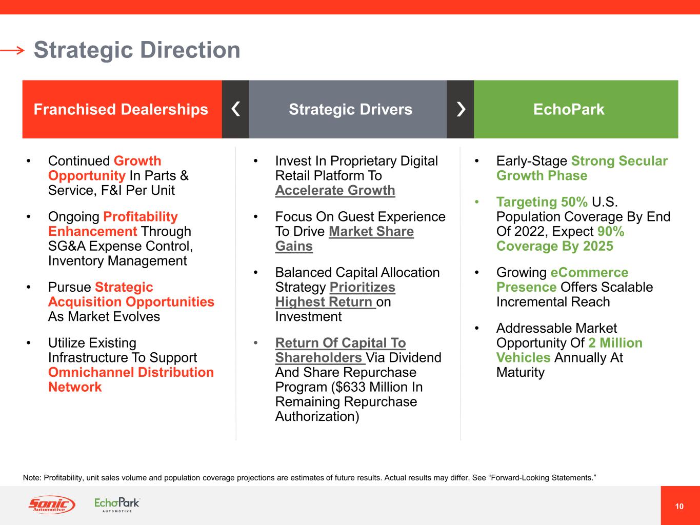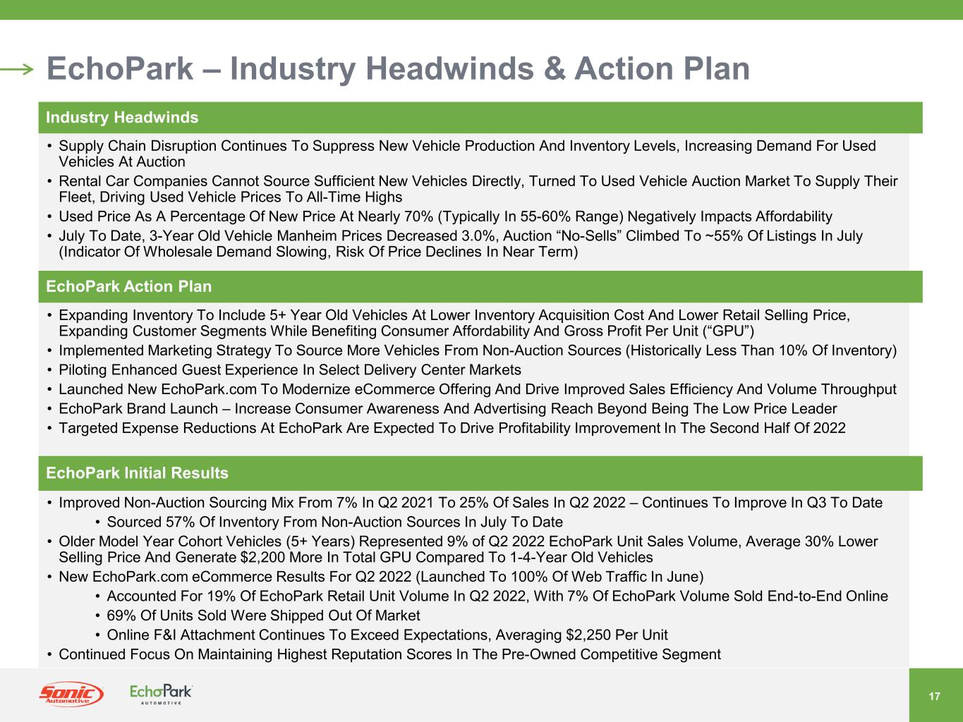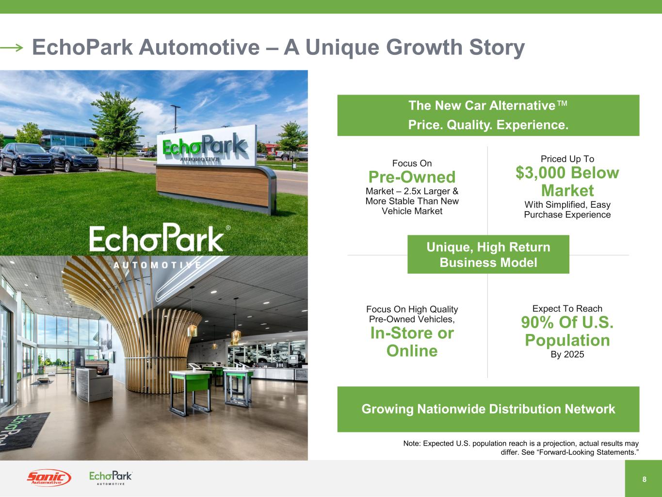 2021年7月、ソニックは、EchoPark事業の戦略的代替案候補を評価するためのレビュープロセスを発表しました。さまざまな選択肢を慎重に評価した結果、当社は検討を終了し、取締役会は、タイミングと現在の市場環境が当社の事業価値創造目標に合致していないと判断しました。ソニックは、今後もエコーパークの拡張計画を実行するとともに、市場環境を注視し、長期的な株主価値を最大化するための潜在的な機会があれば、定期的に検討していく予定です。また、当社はEchoParkの長期的な見通しに引き続き自信を持っていますが、現在の市場環境により、EchoParkの予想売上高成長率を調整し、以前に述べた財務目標の達成を2025年以降に延期することにしました。