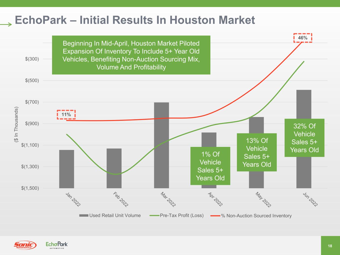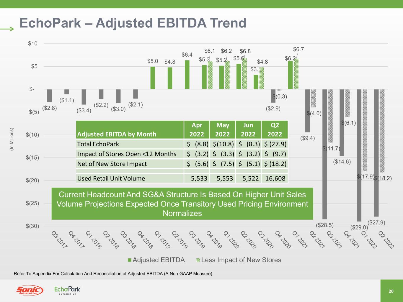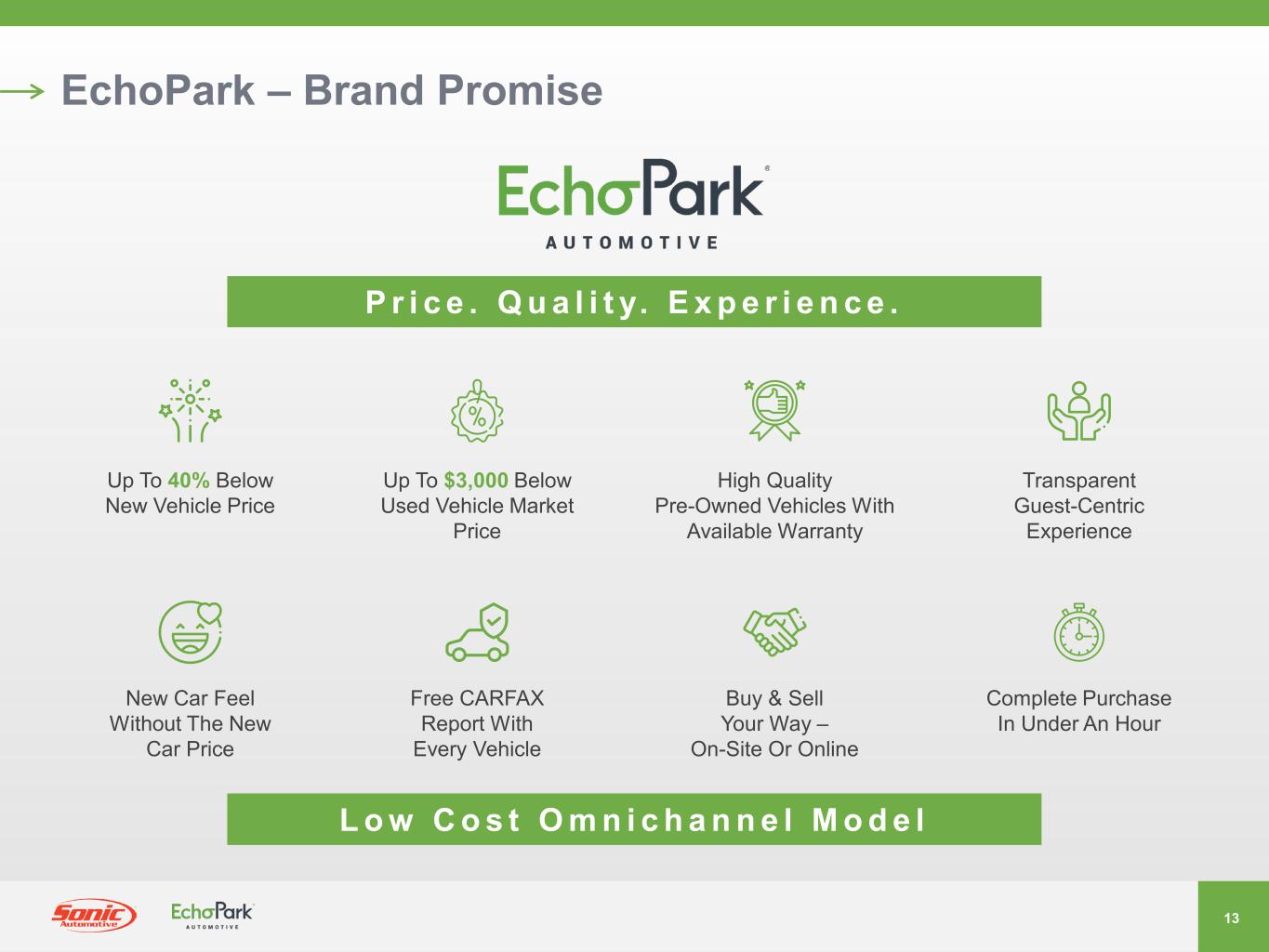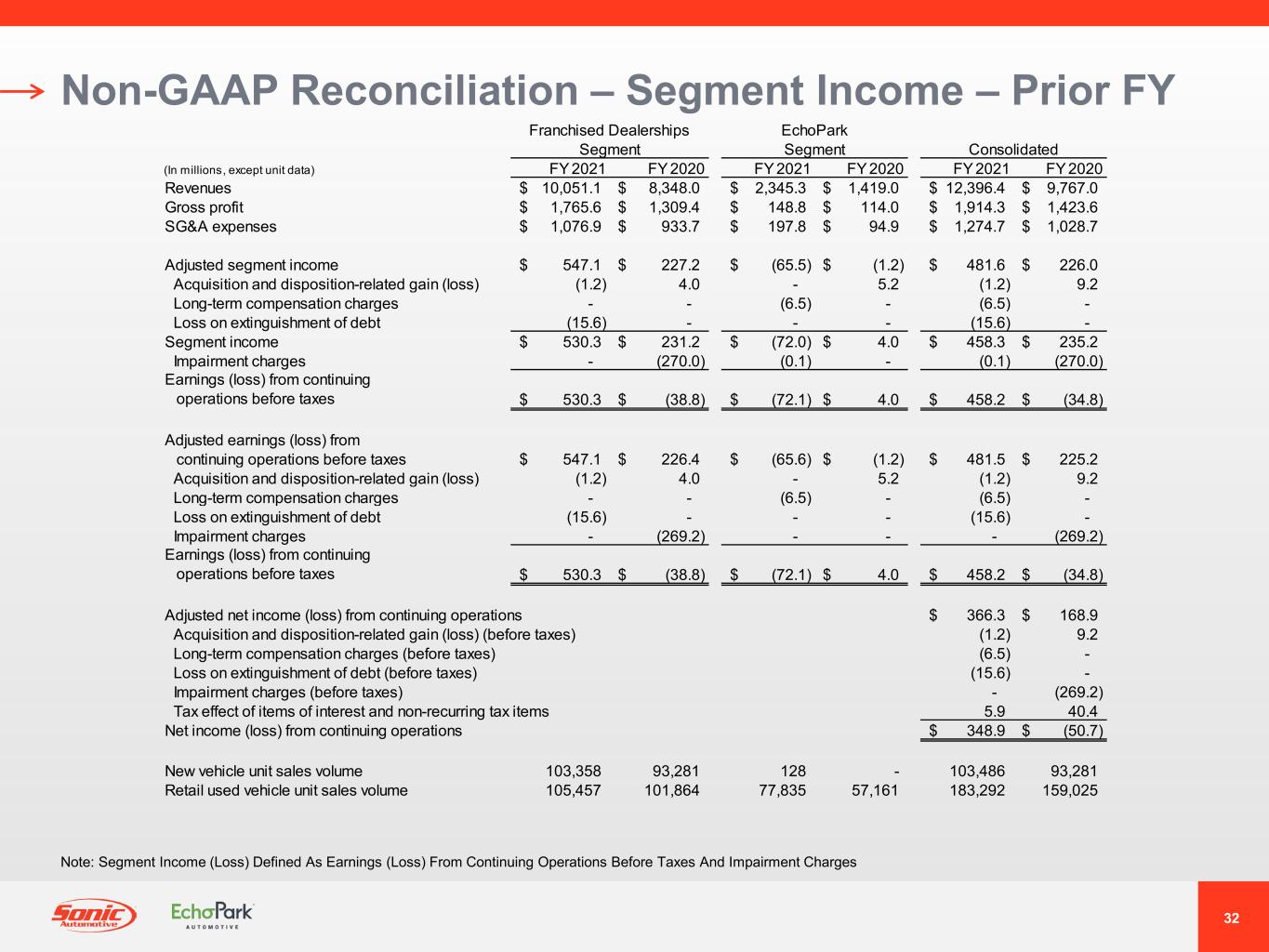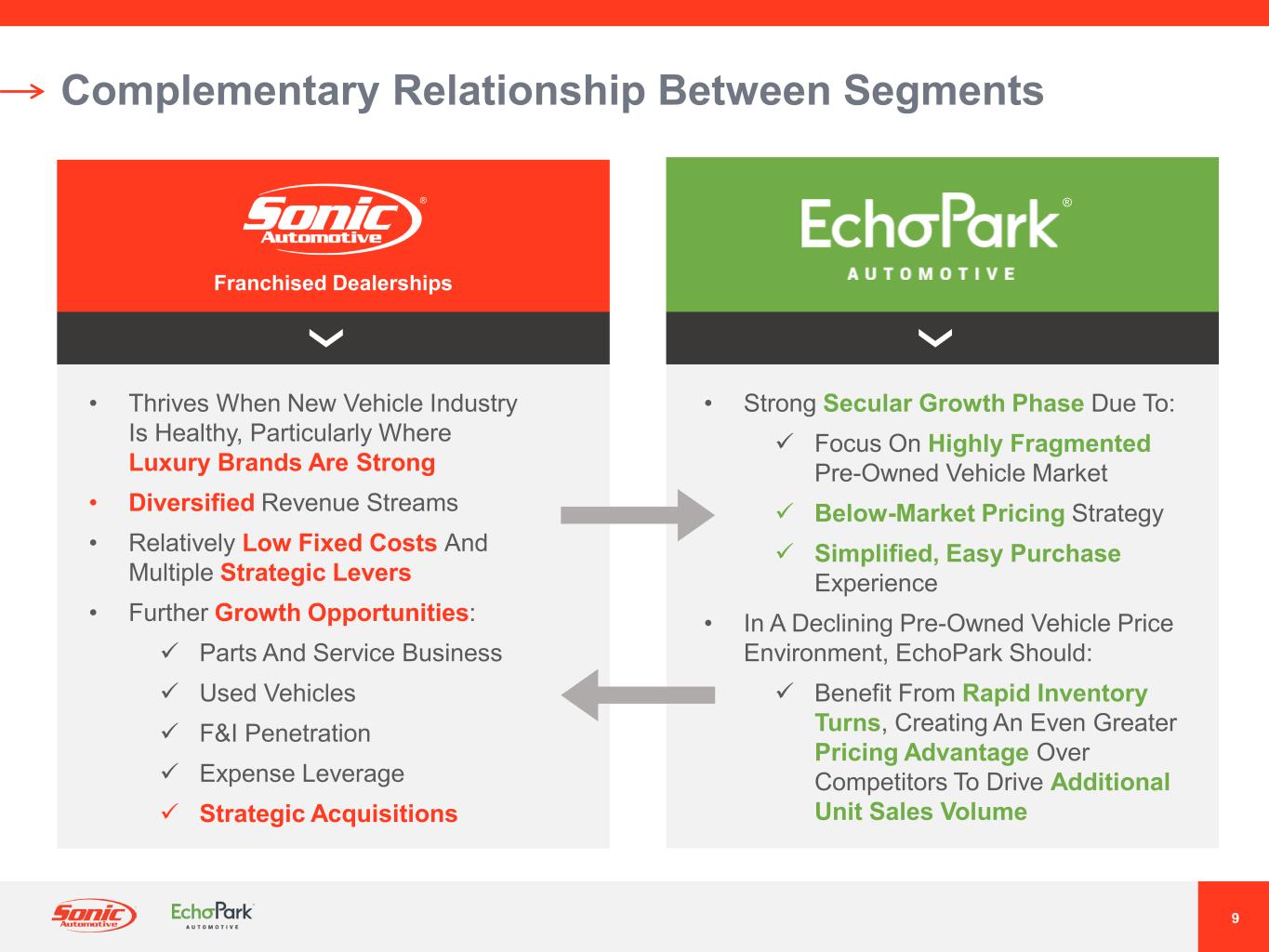 2021年7月、ソニックは、EchoPark事業の戦略的代替案候補を評価するためのレビュープロセスを発表しました。さまざまな選択肢を慎重に評価した結果、当社は検討を終了し、取締役会は、タイミングと現在の市場環境が当社の事業価値創造目標に合致していないと判断しました。ソニックは、今後もエコーパークの拡張計画を実行するとともに、市場環境を注視し、長期的な株主価値を最大化するための潜在的な機会があれば、定期的に検討していく予定です。また、当社はEchoParkの長期的な見通しに引き続き自信を持っていますが、現在の市場環境により、EchoParkの予想売上高成長率を調整し、以前に述べた財務目標の達成を2025年以降に延期することにしました。