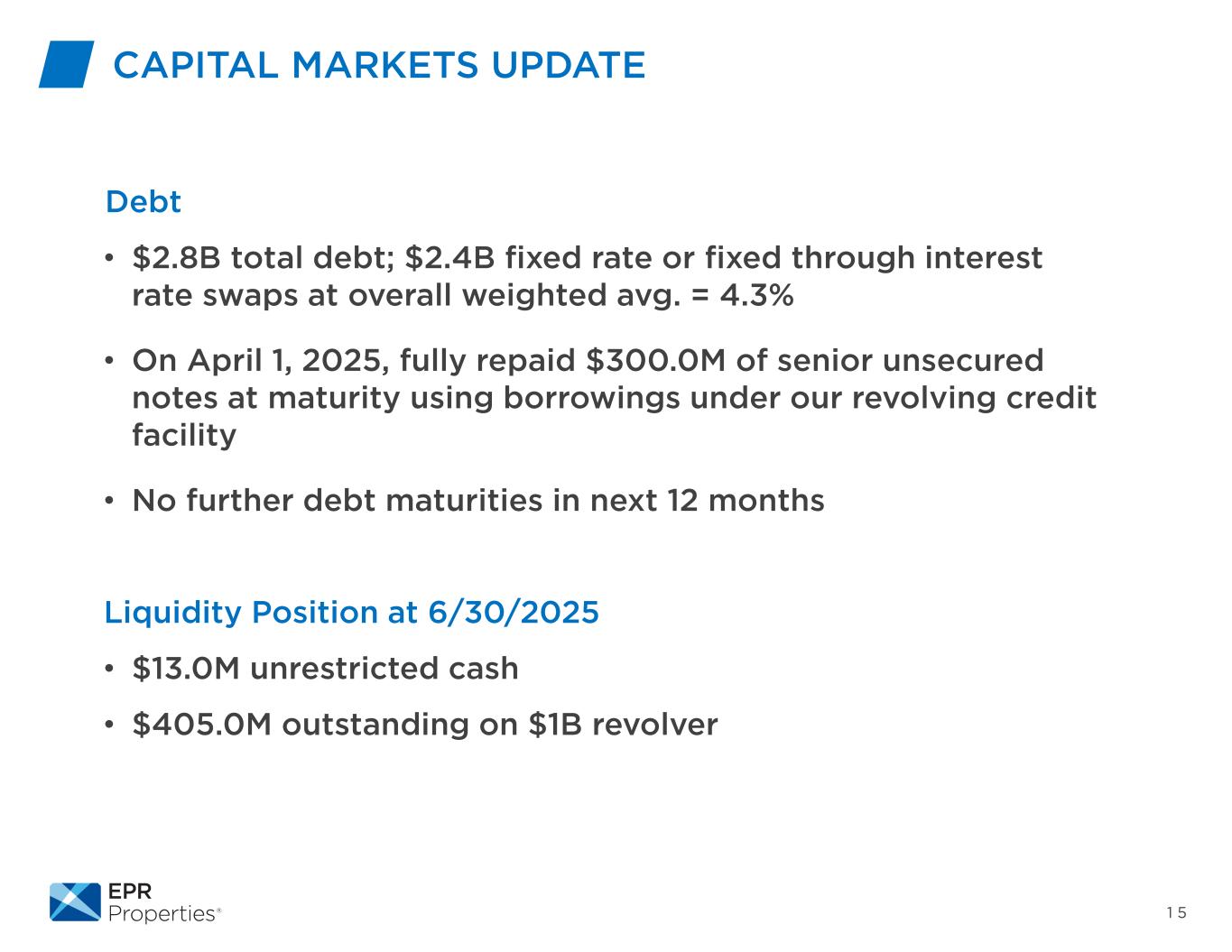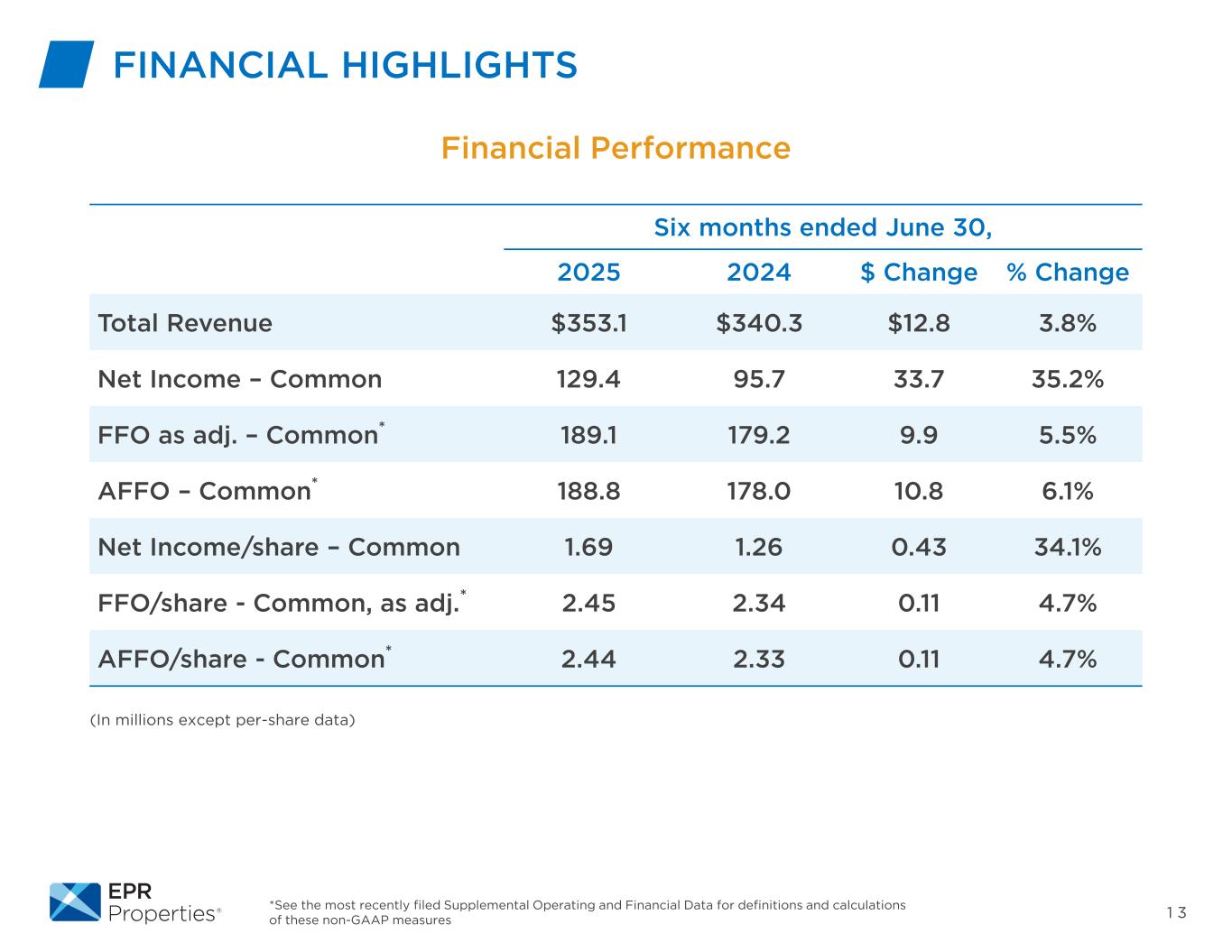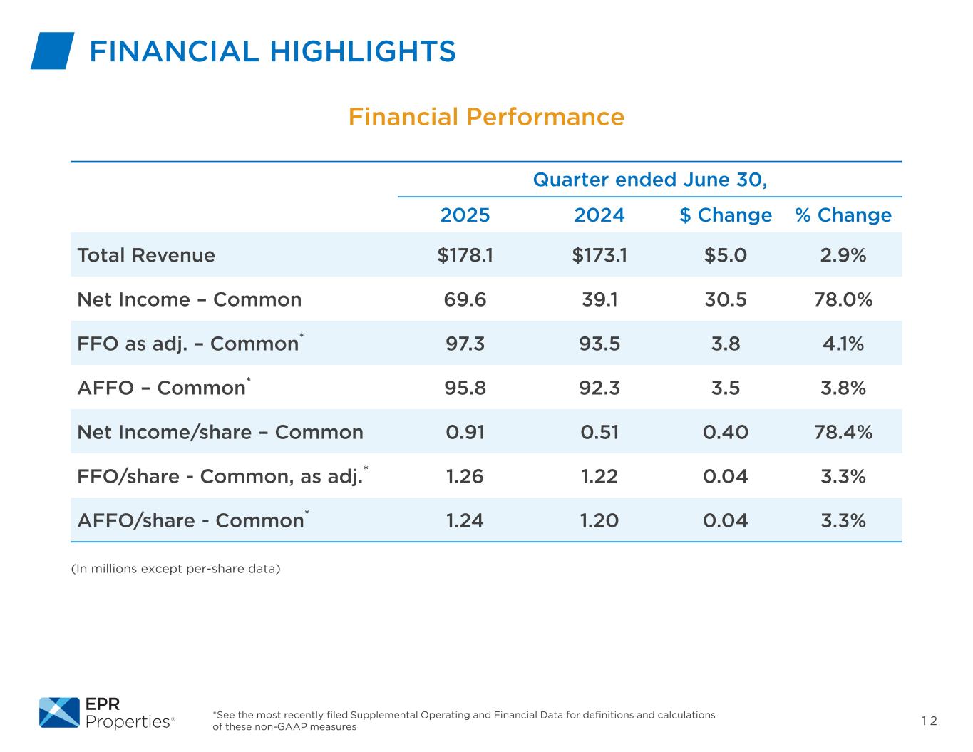 ミズーリ州カンザスシティ、2025年7月30日--EPRプロパティーズ(NYSE:EPR)は本日、2025年6月30日に終了した第2四半期の営業成績を発表した(単位:千ドル、1株当たりデータを除く):