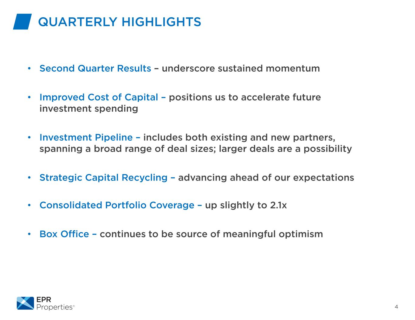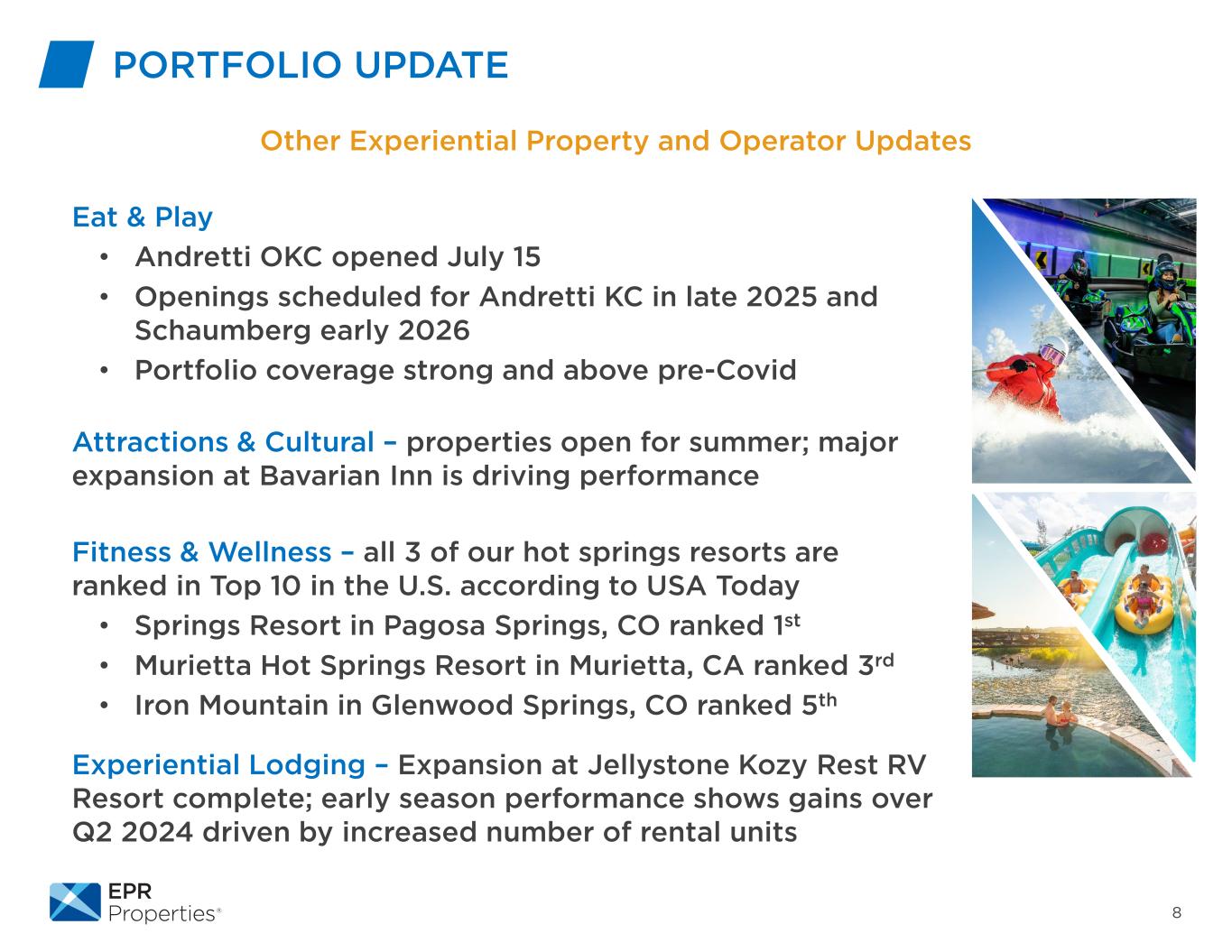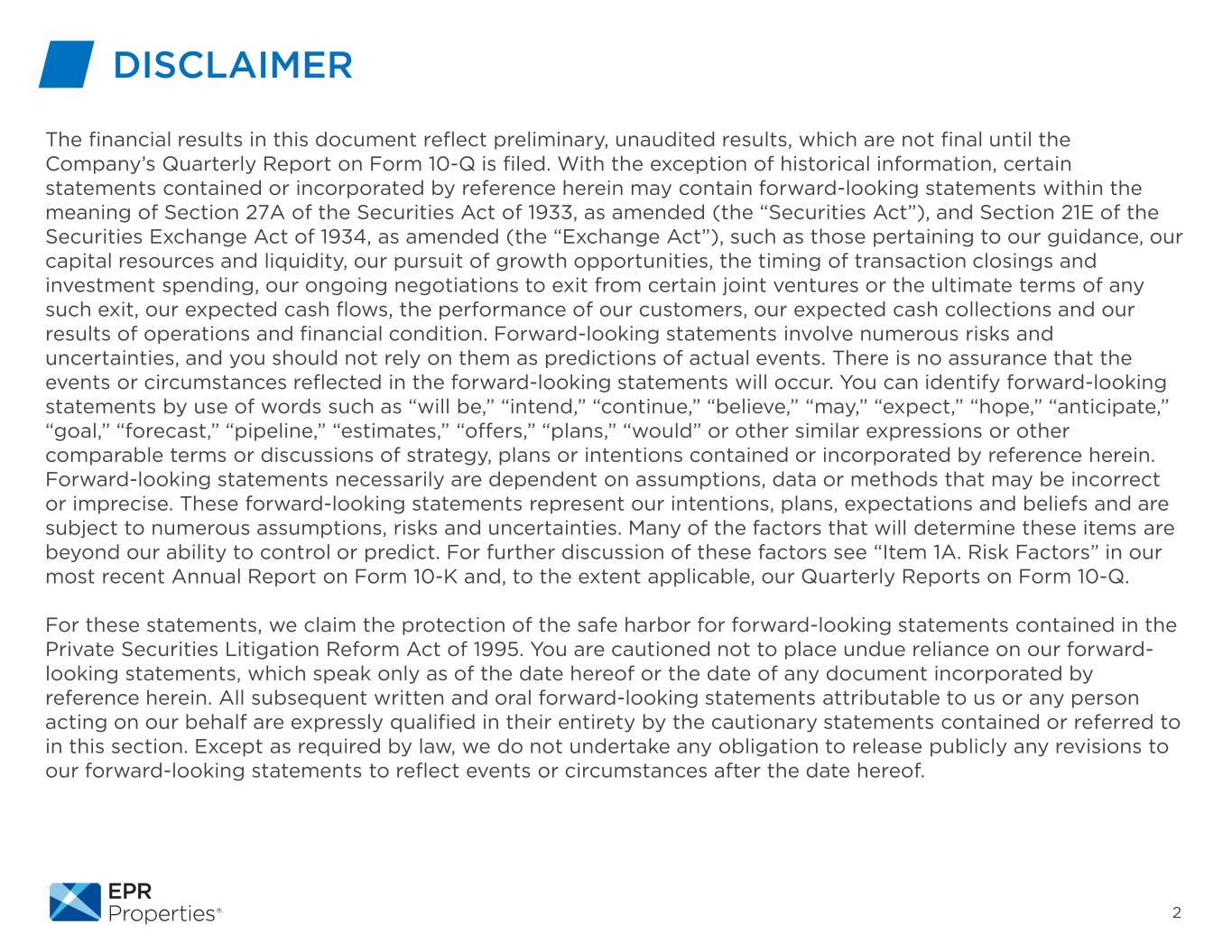 ミズーリ州カンザスシティ、2025年7月30日--EPRプロパティーズ(NYSE:EPR)は本日、2025年6月30日に終了した第2四半期の営業成績を発表した(単位:千ドル、1株当たりデータを除く):