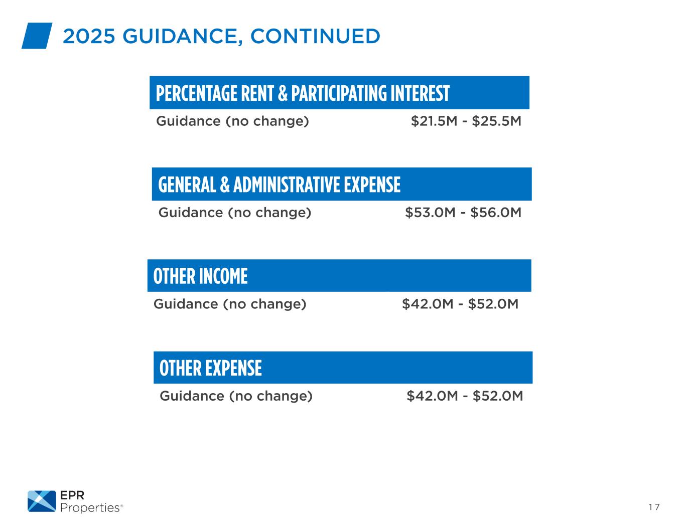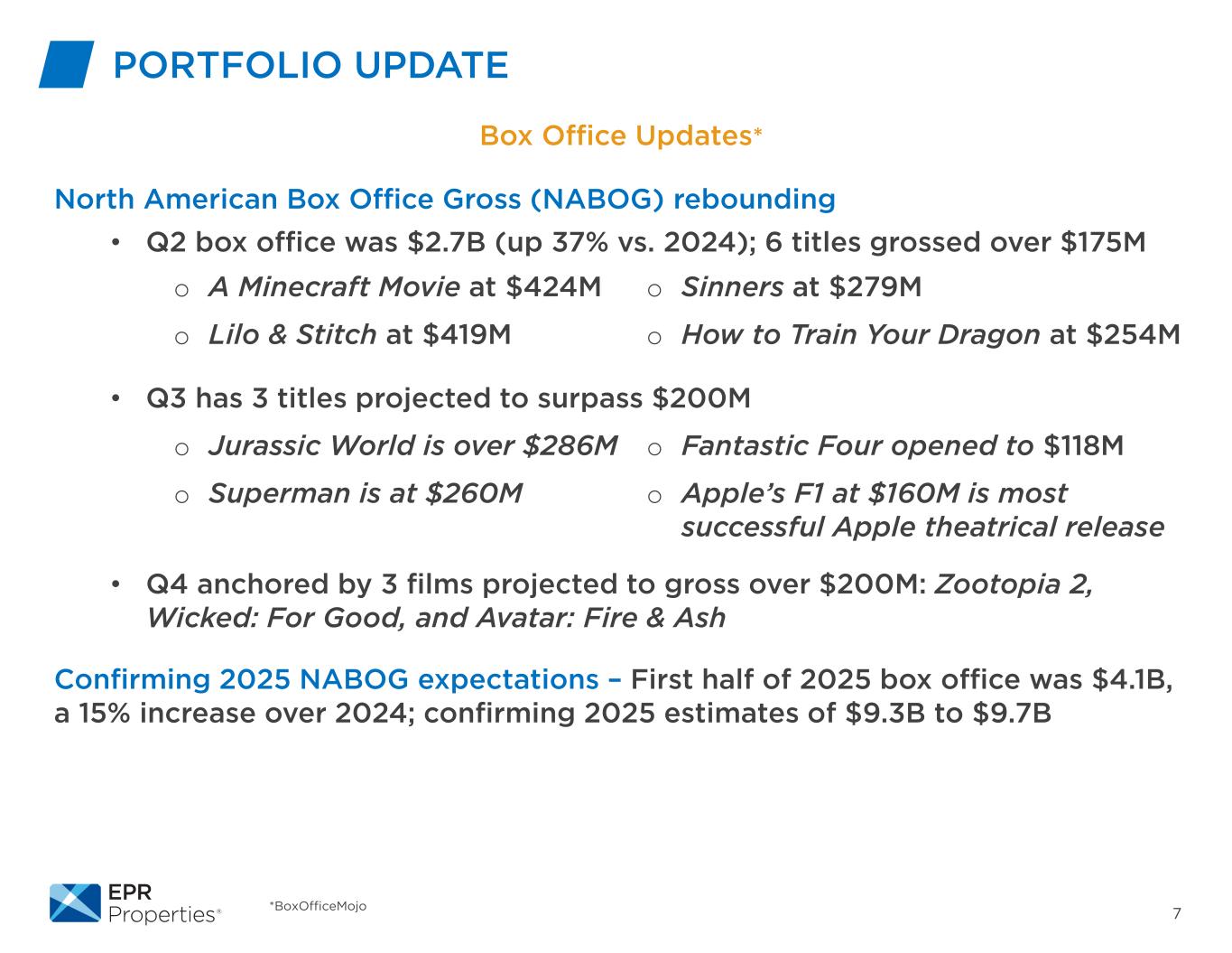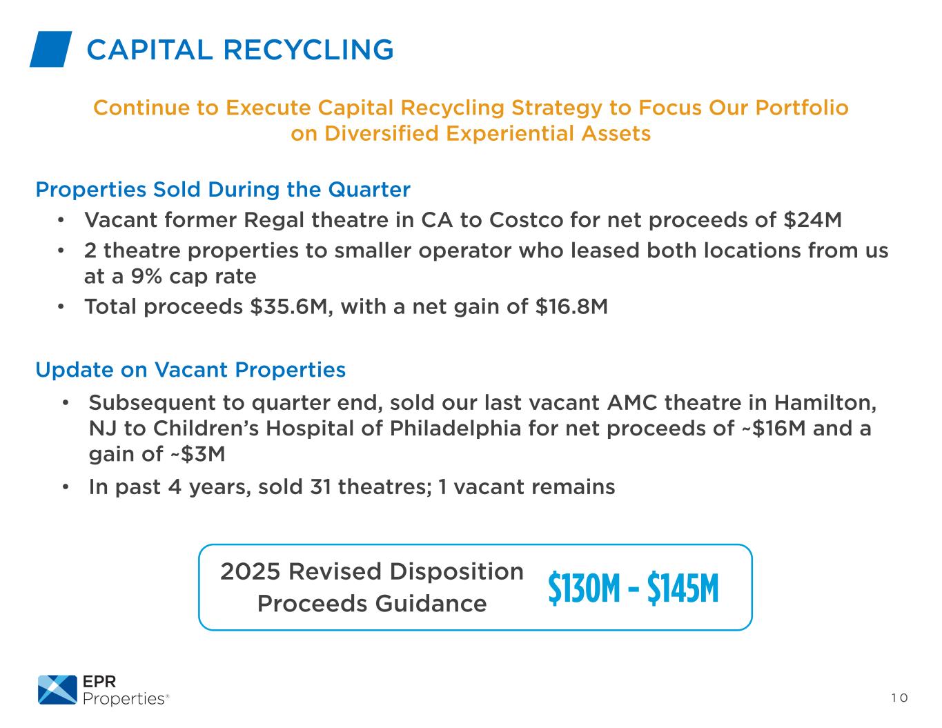 -資本リサイクル-当社は資本リサイクル計画を上回っており、以下に述べるように処分収入のガイダンスを引き上げている。2025年第2四半期中、当社は劇場用不動産3件を売却し、売却総額は3,560万ドル、正味売却益は1,680万ドルでした。当四半期末後、当社はさらに1件の劇場用不動産を売却し、正味売却益は約1,600万ドルとなり、2025年9月30日に終了する第3四半期中にこの売却益約300万ドルを認識する見込みです。