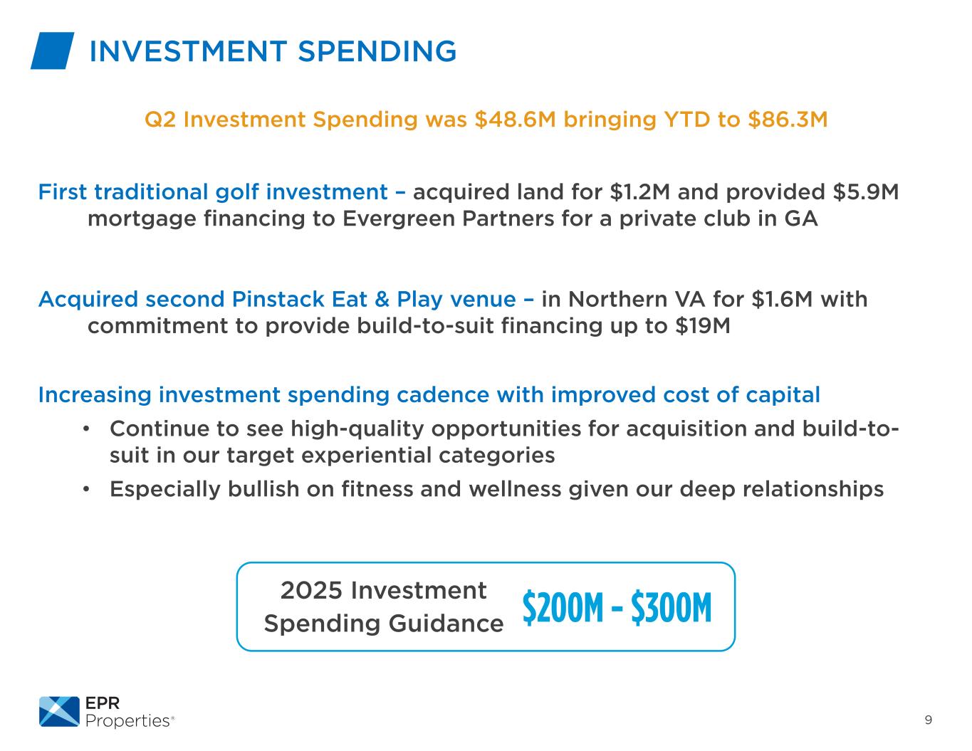 当社の2025年6月30日に終了した3ヶ月間の投資支出は総額4,860万ドルで、2025年6月30日に終了した6ヶ月間の投資支出総額は8,630万ドルとなった。当四半期の投資支出には、ジョージア州のフィットネス&ウェルネス施設の改良を担保とした120万ドルの土地取得と590万ドルの住宅ローン融資、およびバージニア州の新規ビルド・トゥ・スーツのイート&プレイ施設のための160万ドルの土地取得が含まれる。当四半期の残りの投資支出は、主に体験型のビルド・トゥ・スーツ開発および再開発プロジェクトに関連するものであった。
