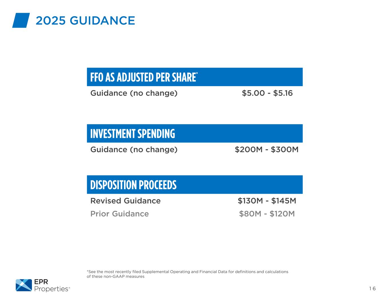 2025年第2四半期中、当社は劇場用不動産1棟(空室)と劇場用不動産2棟(賃貸)を売却し、正味売却収入は3,560万ドル、正味売却益は1,680万ドルとなった。2025年6月30日に終了した6ヵ月間の売却収入は合計1億1,450万ドルでした。当四半期末後、当社はさらに1件の空き劇場物件を約1,600万ドルの純収入で売却し、2025年9月30日に終了する第3四半期中に約300万ドルの売却益を認識する予定です。従って、2025年の売却益のガイダンスを8,000万ドルから1億2,000万ドルから1億3,000万ドルから1億4,500万ドルに引き上げます。