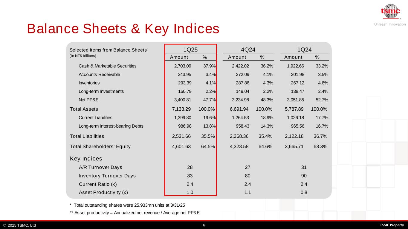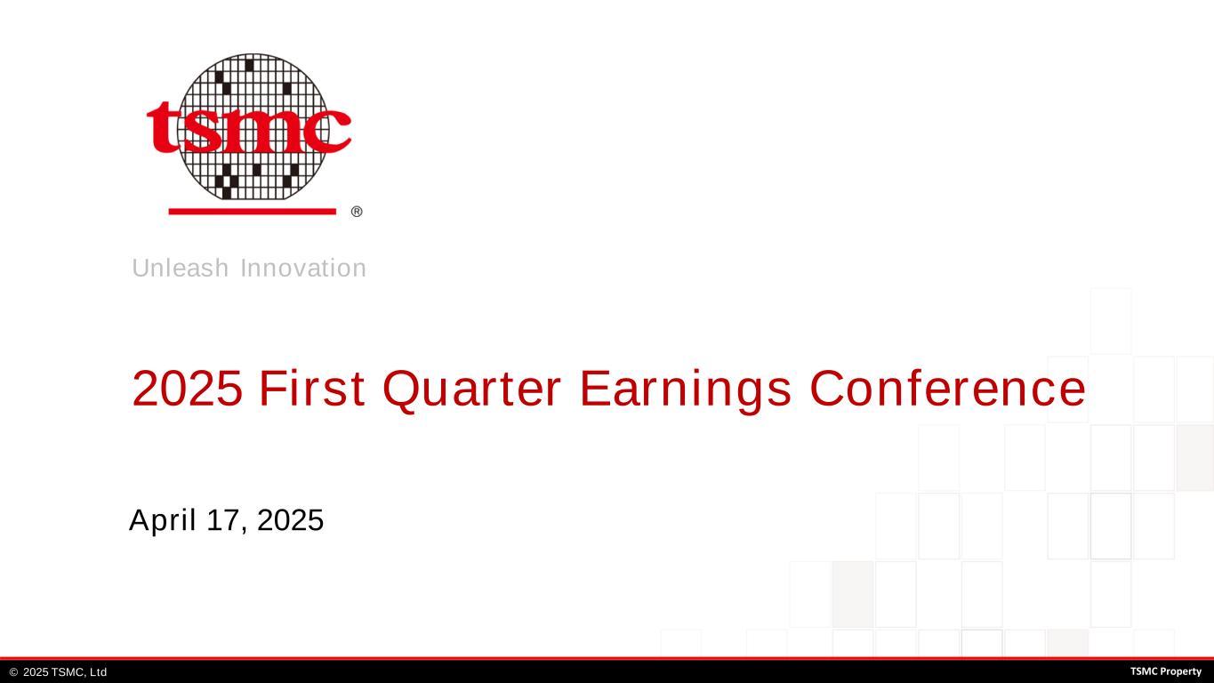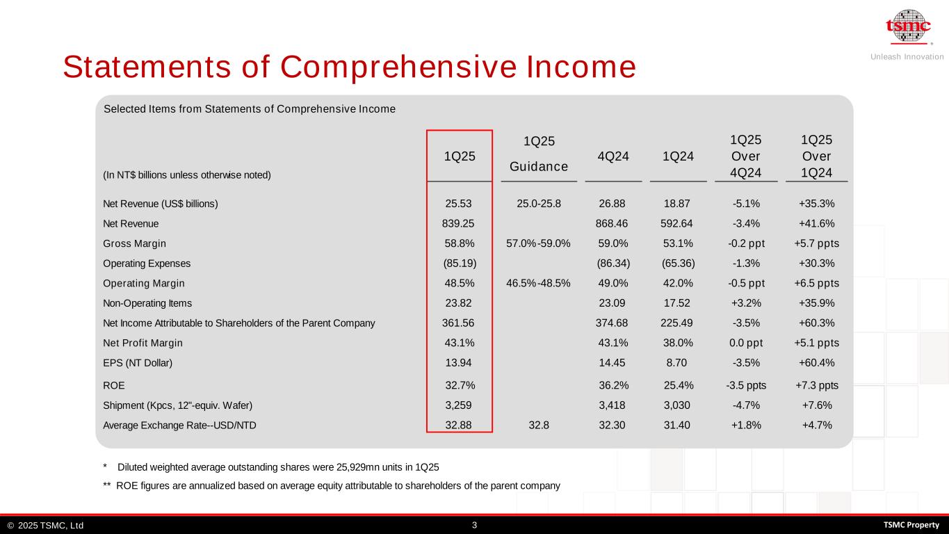 HSINCHU, Taiwan, R.O.C., Apr. 17, 2025 -- TSMC (TWSE: 2330, NYSE: TSM) today announced consolidated revenue of NT$839.25 billion, net income of NT$361.56 billion, and diluted earnings per share of NT$13.94 (US$2.12 per ADR unit) for the first quarter ended March 31, 2025.