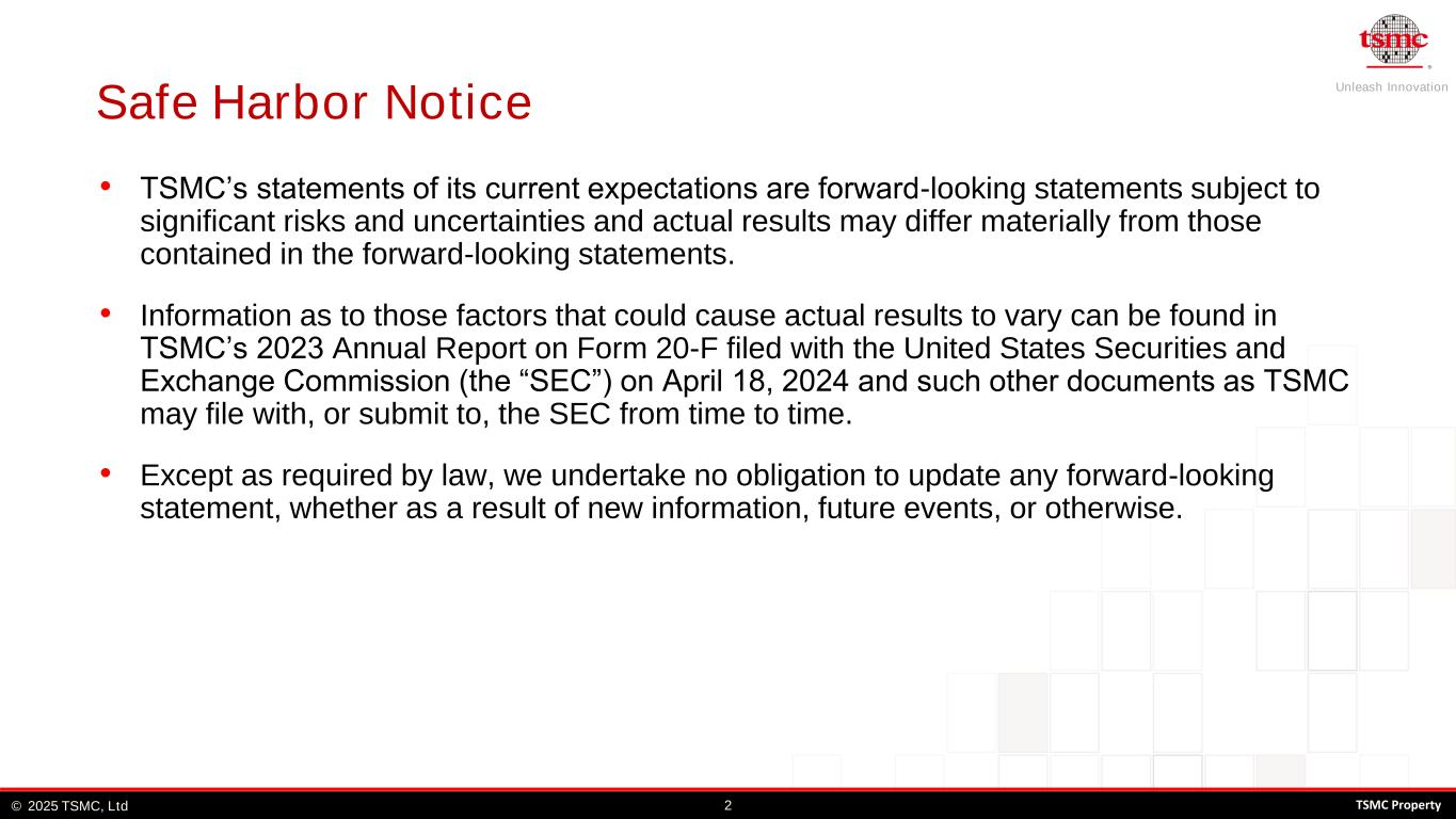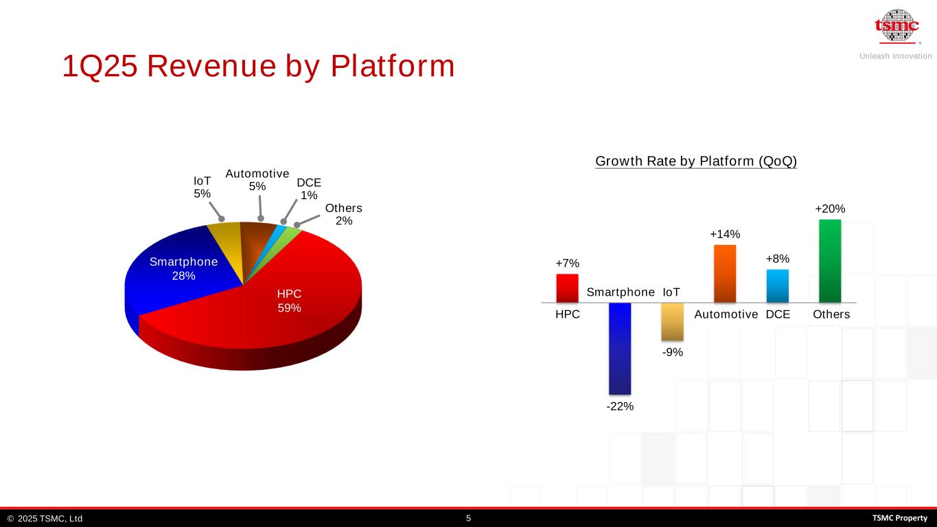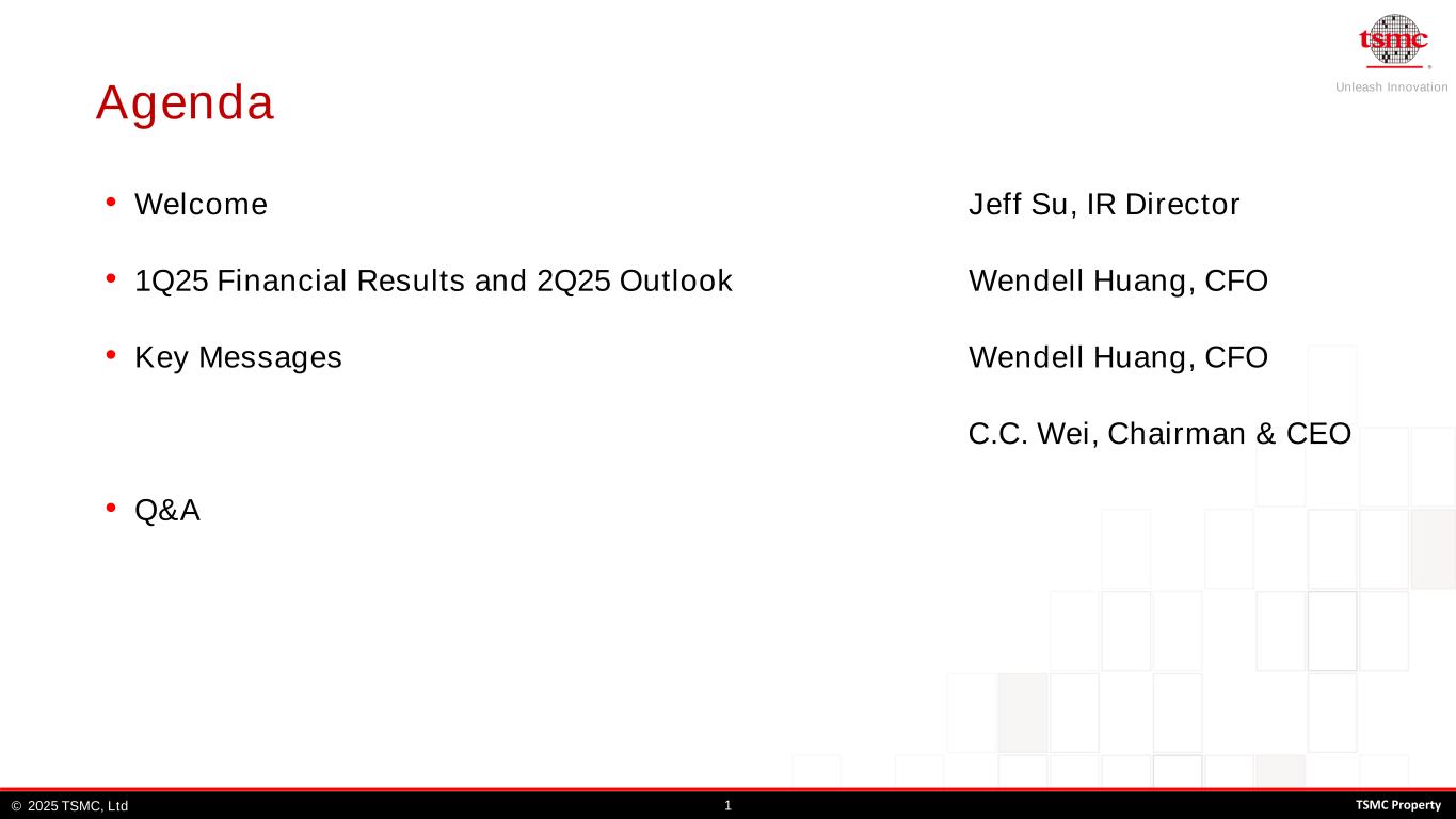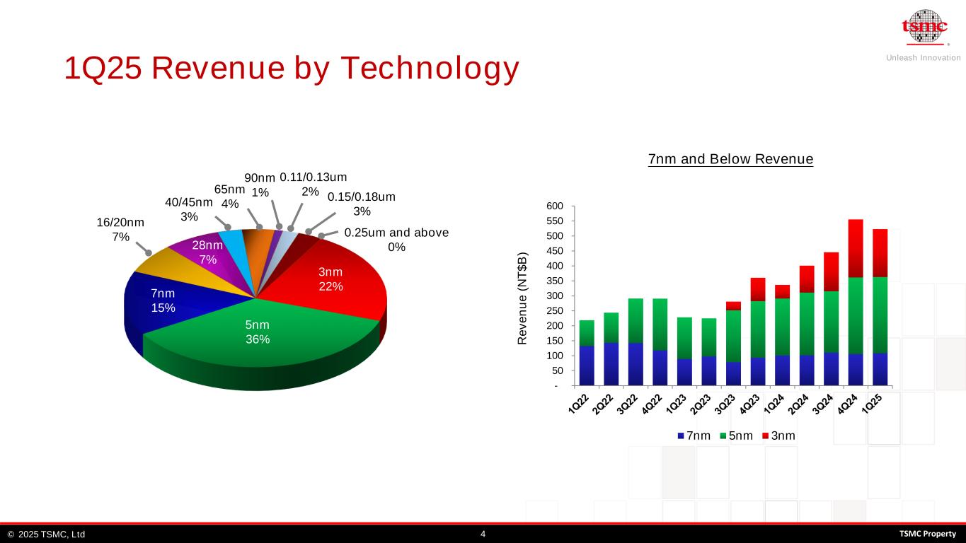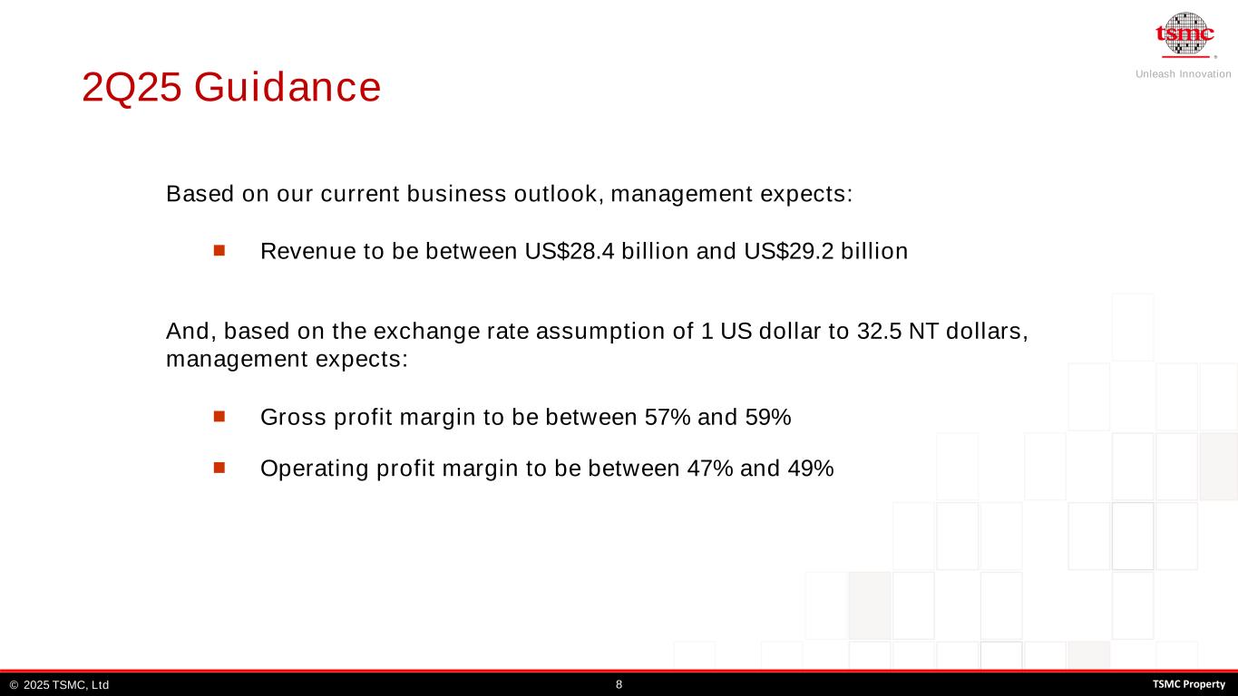 “Our business in the first quarter was impacted by smartphone seasonality, partially offset by continued growth in AI-related demand.” said Wendell Huang, Senior VP and Chief Financial Officer of TSMC. “Moving into second quarter 2025, we expect our business to be supported by strong demand for our industry-leading 3nm and 5nm technologies. While we have not seen any changes in our customers’ behavior so far, uncertainties and risks from the potential impact from tariff policies exist. We will continue to closely monitor the potential impact on the end market demand, and manage our business prudently.”