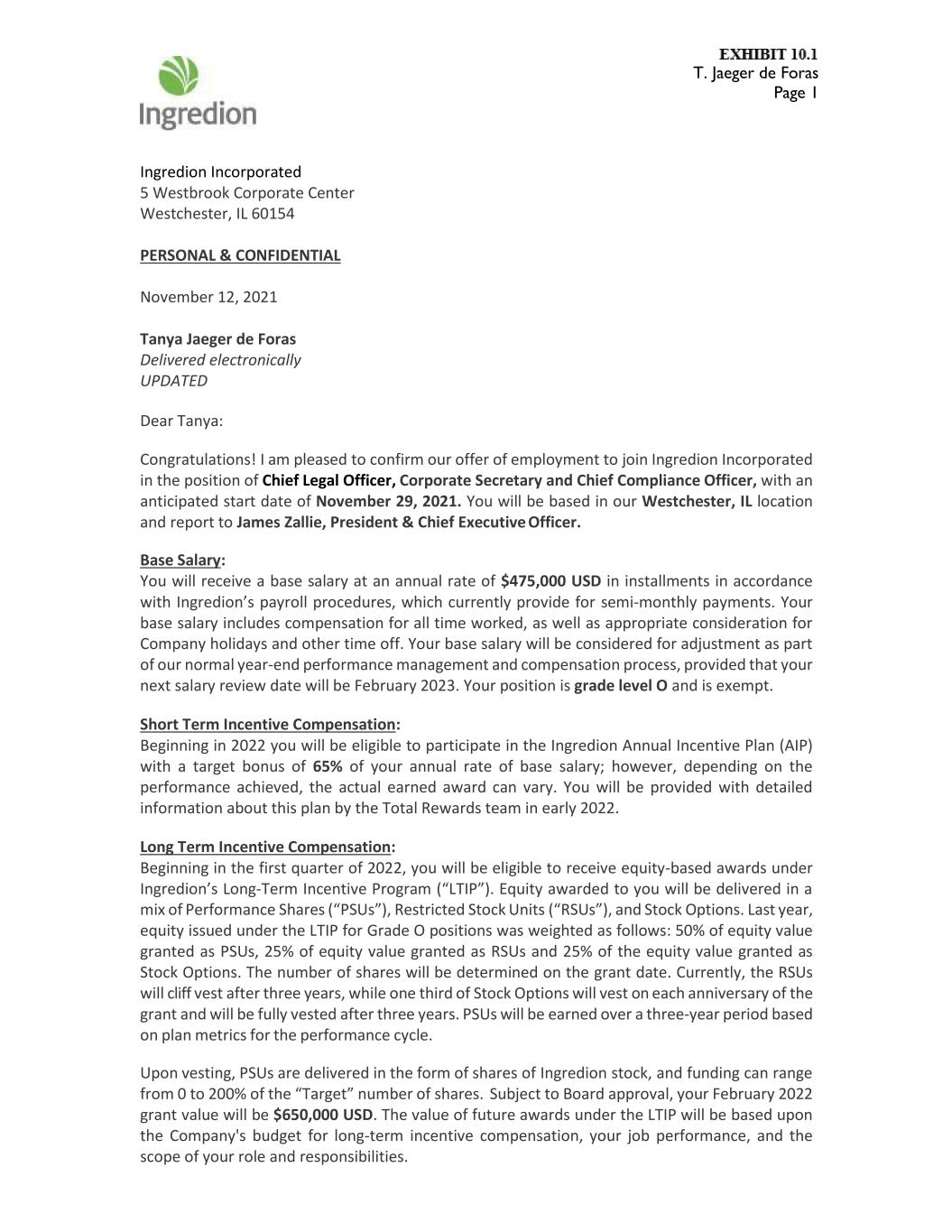 T. Jaeger de Foras Page 1 Ingredion Incorporated 5 Westbrook Corporate Center Westchester, IL 60154 PERSONAL & CONFIDENTIAL November 12, 2021 Tanya Jaeger de Foras Delivered electronically UPDATED Dear Tanya: Congratulations! I am pleased to confirm our offer of employment to join Ingredion Incorporated in the position of Chief Legal Officer, Corporate Secretary and Chief Compliance Officer, with an anticipated start date of November 29, 2021. You will be based in our Westchester, IL location and report to James Zallie, President & Chief Executive Officer. Base Salary: You will receive a base salary at an annual rate of $475,000 USD in installments in accordance with Ingredion’s payroll procedures, which currently provide for semi-monthly payments. Your base salary includes compensation for all time worked, as well as appropriate consideration for Company holidays and other time off. Your base salary will be considered for adjustment as part of our normal year-end performance management and compensation process, provided that your next salary review date will be February 2023. Your position is grade level O and is exempt. Short Term Incentive Compensation: Beginning in 2022 you will be eligible to participate in the Ingredion Annual Incentive Plan (AIP) with a target bonus of 65% of your annual rate of base salary; however, depending on the performance achieved, the actual earned award can vary. You will be provided with detailed information about this plan by the Total Rewards team in early 2022. Long Term Incentive Compensation: Beginning in the first quarter of 2022, you will be eligible to receive equity-based awards under Ingredion’s Long-Term Incentive Program (“LTIP”). Equity awarded to you will be delivered in a mix of Performance Shares (“PSUs”), Restricted Stock Units (“RSUs”), and Stock Options. Last year, equity issued under the LTIP for Grade O positions was weighted as follows: 50% of equity value granted as PSUs, 25% of equity value granted as RSUs and 25% of the equity value granted as Stock Options. The number of shares will be determined on the grant date. Currently, the RSUs will cliff vest after three years, while one third of Stock Options will vest on each anniversary of the grant and will be fully vested after three years. PSUs will be earned over a three-year period based on plan metrics for the performance cycle. Upon vesting, PSUs are delivered in the form of shares of Ingredion stock, and funding can range from 0 to 200% of the “Target” number of shares. Subject to Board approval, your February 2022 grant value will be $650,000 USD. The value of future awards under the LTIP will be based upon the Company's budget for long-term incentive compensation, your job performance, and the scope of your role and responsibilities.
