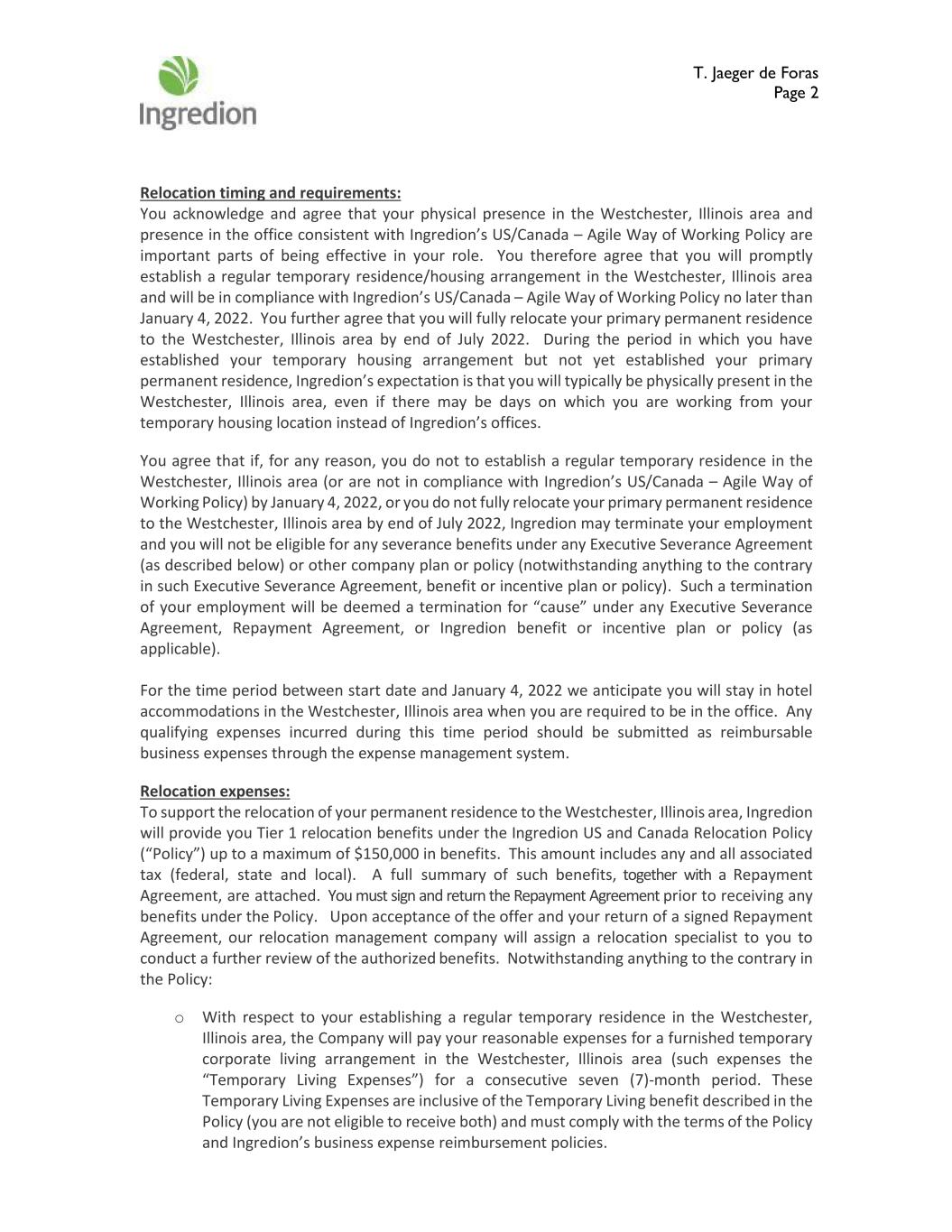 T. Jaeger de Foras Page 2 Relocation timing and requirements: You acknowledge and agree that your physical presence in the Westchester, Illinois area and presence in the office consistent with Ingredion’s US/Canada – Agile Way of Working Policy are important parts of being effective in your role. You therefore agree that you will promptly establish a regular temporary residence/housing arrangement in the Westchester, Illinois area and will be in compliance with Ingredion’s US/Canada – Agile Way of Working Policy no later than January 4, 2022. You further agree that you will fully relocate your primary permanent residence to the Westchester, Illinois area by end of July 2022. During the period in which you have established your temporary housing arrangement but not yet established your primary permanent residence, Ingredion’s expectation is that you will typically be physically present in the Westchester, Illinois area, even if there may be days on which you are working from your temporary housing location instead of Ingredion’s offices. You agree that if, for any reason, you do not to establish a regular temporary residence in the Westchester, Illinois area (or are not in compliance with Ingredion’s US/Canada – Agile Way of Working Policy) by January 4, 2022, or you do not fully relocate your primary permanent residence to the Westchester, Illinois area by end of July 2022, Ingredion may terminate your employment and you will not be eligible for any severance benefits under any Executive Severance Agreement (as described below) or other company plan or policy (notwithstanding anything to the contrary in such Executive Severance Agreement, benefit or incentive plan or policy). Such a termination of your employment will be deemed a termination for “cause” under any Executive Severance Agreement, Repayment Agreement, or Ingredion benefit or incentive plan or policy (as applicable). For the time period between start date and January 4, 2022 we anticipate you will stay in hotel accommodations in the Westchester, Illinois area when you are required to be in the office. Any qualifying expenses incurred during this time period should be submitted as reimbursable business expenses through the expense management system. Relocation expenses: To support the relocation of your permanent residence to the Westchester, Illinois area, Ingredion will provide you Tier 1 relocation benefits under the Ingredion US and Canada Relocation Policy (“Policy”) up to a maximum of $150,000 in benefits. This amount includes any and all associated tax (federal, state and local). A full summary of such benefits, together with a Repayment Agreement, are attached. You must sign and return the Repayment Agreement prior to receiving any benefits under the Policy. Upon acceptance of the offer and your return of a signed Repayment Agreement, our relocation management company will assign a relocation specialist to you to conduct a further review of the authorized benefits. Notwithstanding anything to the contrary in the Policy: o With respect to your establishing a regular temporary residence in the Westchester, Illinois area, the Company will pay your reasonable expenses for a furnished temporary corporate living arrangement in the Westchester, Illinois area (such expenses the “Temporary Living Expenses”) for a consecutive seven (7)-month period. These Temporary Living Expenses are inclusive of the Temporary Living benefit described in the Policy (you are not eligible to receive both) and must comply with the terms of the Policy and Ingredion’s business expense reimbursement policies.