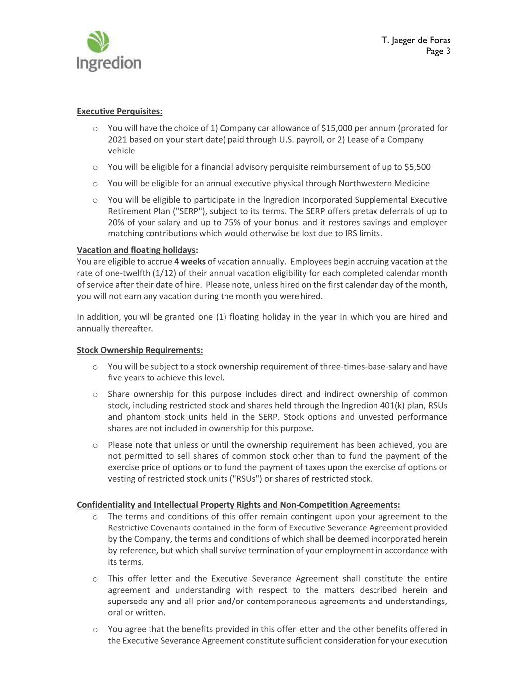 T. Jaeger de Foras Page 3 Executive Perquisites: o You will have the choice of 1) Company car allowance of $15,000 per annum (prorated for 2021 based on your start date) paid through U.S. payroll, or 2) Lease of a Company vehicle o You will be eligible for a financial advisory perquisite reimbursement of up to $5,500 o You will be eligible for an annual executive physical through Northwestern Medicine o You will be eligible to participate in the lngredion Incorporated Supplemental Executive Retirement Plan ("SERP"), subject to its terms. The SERP offers pretax deferrals of up to 20% of your salary and up to 75% of your bonus, and it restores savings and employer matching contributions which would otherwise be lost due to IRS limits. Vacation and floating holidays: You are eligible to accrue 4 weeks of vacation annually. Employees begin accruing vacation at the rate of one-twelfth (1/12) of their annual vacation eligibility for each completed calendar month of service after their date of hire. Please note, unless hired on the first calendar day of the month, you will not earn any vacation during the month you were hired. In addition, you will be granted one (1) floating holiday in the year in which you are hired and annually thereafter. Stock Ownership Requirements: o You will be subject to a stock ownership requirement of three-times-base-salary and have five years to achieve this level. o Share ownership for this purpose includes direct and indirect ownership of common stock, including restricted stock and shares held through the lngredion 401(k) plan, RSUs and phantom stock units held in the SERP. Stock options and unvested performance shares are not included in ownership for this purpose. o Please note that unless or until the ownership requirement has been achieved, you are not permitted to sell shares of common stock other than to fund the payment of the exercise price of options or to fund the payment of taxes upon the exercise of options or vesting of restricted stock units ("RSUs") or shares of restricted stock. Confidentiality and Intellectual Property Rights and Non-Competition Agreements: o The terms and conditions of this offer remain contingent upon your agreement to the Restrictive Covenants contained in the form of Executive Severance Agreement provided by the Company, the terms and conditions of which shall be deemed incorporated herein by reference, but which shall survive termination of your employment in accordance with its terms. o This offer letter and the Executive Severance Agreement shall constitute the entire agreement and understanding with respect to the matters described herein and supersede any and all prior and/or contemporaneous agreements and understandings, oral or written. o You agree that the benefits provided in this offer letter and the other benefits offered in the Executive Severance Agreement constitute sufficient consideration for your execution