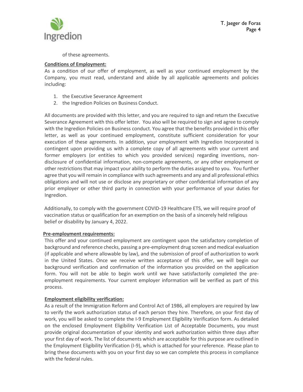 T. Jaeger de Foras Page 4 of these agreements. Conditions of Employment: As a condition of our offer of employment, as well as your continued employment by the Company, you must read, understand and abide by all applicable agreements and policies including: 1. the Executive Severance Agreement 2. the Ingredion Policies on Business Conduct. All documents are provided with this letter, and you are required to sign and return the Executive Severance Agreement with this offer letter. You also will be required to sign and agree to comply with the Ingredion Policies on Business conduct. You agree that the benefits provided in this offer letter, as well as your continued employment, constitute sufficient consideration for your execution of these agreements. In addition, your employment with Ingredion Incorporated is contingent upon providing us with a complete copy of all agreements with your current and former employers (or entities to which you provided services) regarding inventions, non- disclosure of confidential information, non-compete agreements, or any other employment or other restrictions that may impact your ability to perform the duties assigned to you. You further agree that you will remain in compliance with such agreements and any and all professional ethics obligations and will not use or disclose any proprietary or other confidential information of any prior employer or other third party in connection with your performance of your duties for Ingredion. Additionally, to comply with the government COVID-19 Healthcare ETS, we will require proof of vaccination status or qualification for an exemption on the basis of a sincerely held religious belief or disability by January 4, 2022. Pre-employment requirements: This offer and your continued employment are contingent upon the satisfactory completion of background and reference checks, passing a pre-employment drug screen and medical evaluation (if applicable and where allowable by law), and the submission of proof of authorization to work in the United States. Once we receive written acceptance of this offer, we will begin our background verification and confirmation of the information you provided on the application form. You will not be able to begin work until we have satisfactorily completed the pre- employment requirements. Your current employer information will be verified as part of this process. Employment eligibility verification: As a result of the Immigration Reform and Control Act of 1986, all employers are required by law to verify the work authorization status of each person they hire. Therefore, on your first day of work, you will be asked to complete the I-9 Employment Eligibility Verification form. As detailed on the enclosed Employment Eligibility Verification List of Acceptable Documents, you must provide original documentation of your identity and work authorization within three days after your first day of work. The list of documents which are acceptable for this purpose are outlined in the Employment Eligibility Verification (I-9), which is attached for your reference. Please plan to bring these documents with you on your first day so we can complete this process in compliance with the federal rules.