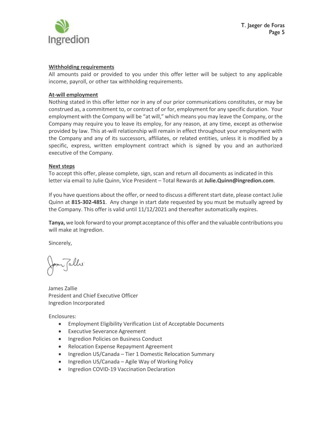 T. Jaeger de Foras Page 5 Withholding requirements All amounts paid or provided to you under this offer letter will be subject to any applicable income, payroll, or other tax withholding requirements. At-will employment Nothing stated in this offer letter nor in any of our prior communications constitutes, or may be construed as, a commitment to, or contract of or for, employment for any specific duration. Your employment with the Company will be “at will,” which means you may leave the Company, or the Company may require you to leave its employ, for any reason, at any time, except as otherwise provided by law. This at-will relationship will remain in effect throughout your employment with the Company and any of its successors, affiliates, or related entities, unless it is modified by a specific, express, written employment contract which is signed by you and an authorized executive of the Company. Next steps To accept this offer, please complete, sign, scan and return all documents as indicated in this letter via email to Julie Quinn, Vice President – Total Rewards at Julie.Quinn@ingredion.com. If you have questions about the offer, or need to discuss a different start date, please contact Julie Quinn at 815-302-4851. Any change in start date requested by you must be mutually agreed by the Company. This offer is valid until 11/12/2021 and thereafter automatically expires. Tanya, we look forward to your prompt acceptance of this offer and the valuable contributions you will make at Ingredion. Sincerely, James Zallie President and Chief Executive Officer Ingredion Incorporated Enclosures: • Employment Eligibility Verification List of Acceptable Documents • Executive Severance Agreement • Ingredion Policies on Business Conduct • Relocation Expense Repayment Agreement • Ingredion US/Canada – Tier 1 Domestic Relocation Summary • Ingredion US/Canada – Agile Way of Working Policy • Ingredion COVID-19 Vaccination Declaration