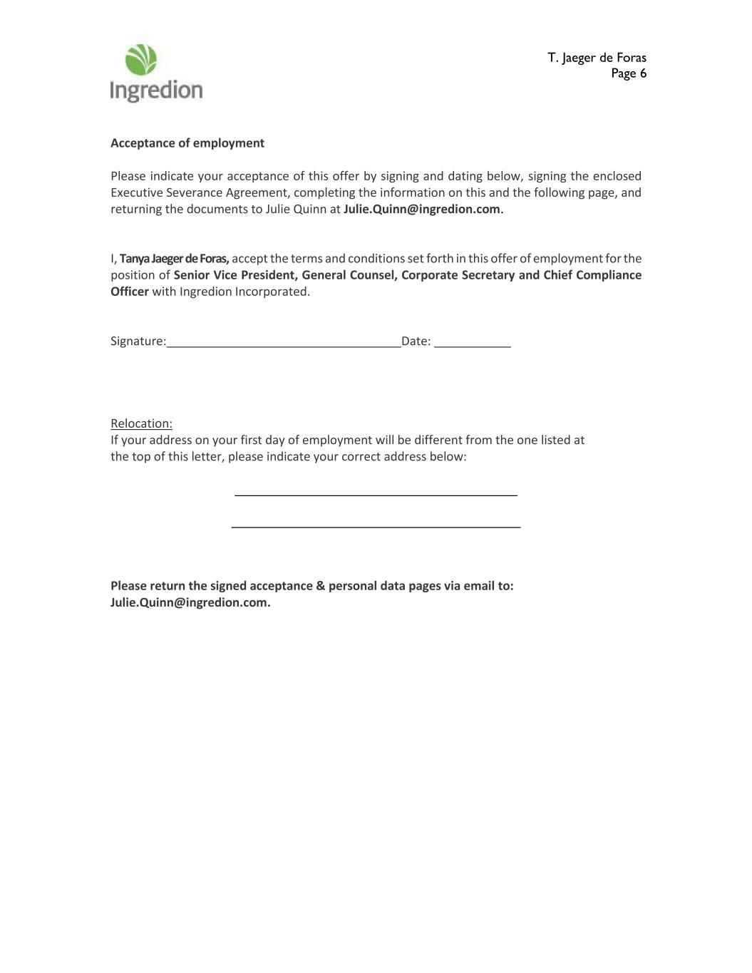T. Jaeger de Foras Page 6 Acceptance of employment Please indicate your acceptance of this offer by signing and dating below, signing the enclosed Executive Severance Agreement, completing the information on this and the following page, and returning the documents to Julie Quinn at Julie.Quinn@ingredion.com. I, Tanya Jaeger de Foras, accept the terms and conditions set forth in this offer of employment for the position of Senior Vice President, General Counsel, Corporate Secretary and Chief Compliance Officer with Ingredion Incorporated. Signature: Date: Relocation: If your address on your first day of employment will be different from the one listed at the top of this letter, please indicate your correct address below: Please return the signed acceptance & personal data pages via email to: Julie.Quinn@ingredion.com.