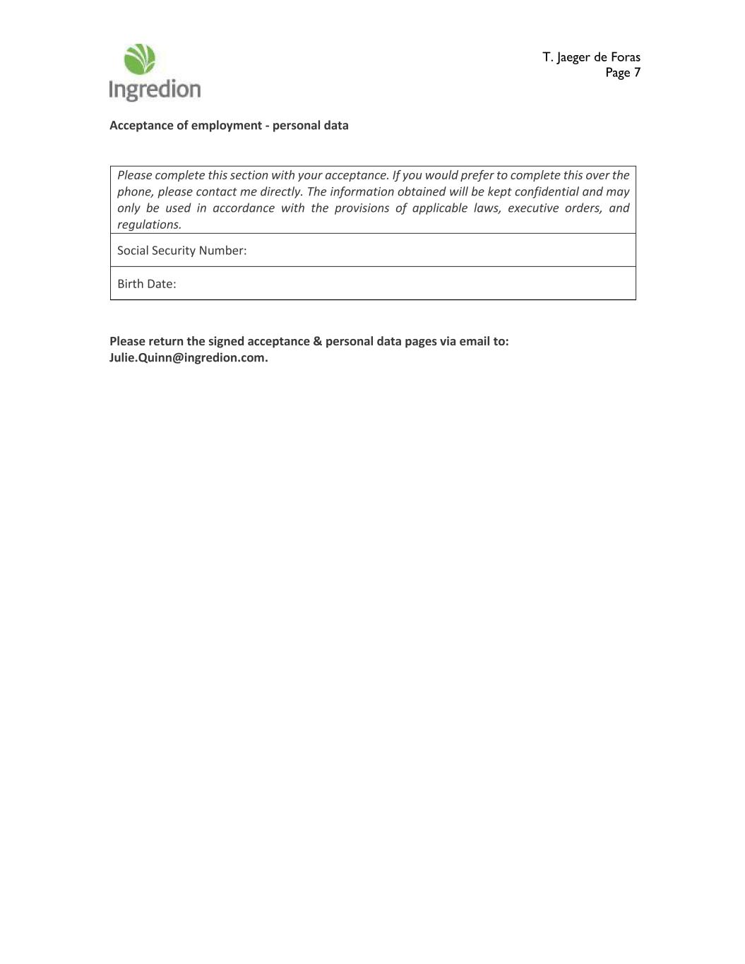 T. Jaeger de Foras Page 7 Acceptance of employment - personal data Please complete this section with your acceptance. If you would prefer to complete this over the phone, please contact me directly. The information obtained will be kept confidential and may only be used in accordance with the provisions of applicable laws, executive orders, and regulations. Social Security Number: Birth Date: Please return the signed acceptance & personal data pages via email to: Julie.Quinn@ingredion.com.