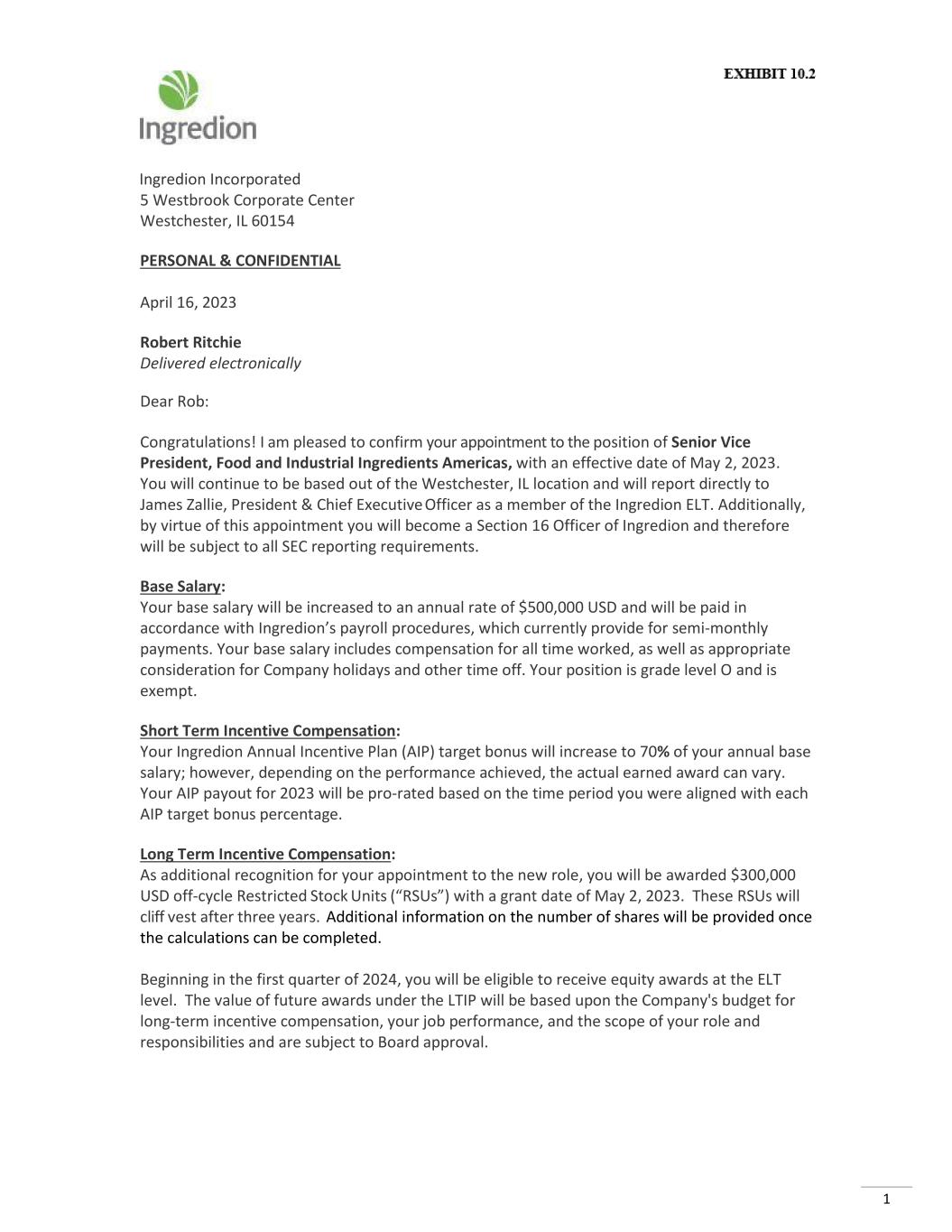 1 Ingredion Incorporated 5 Westbrook Corporate Center Westchester, IL 60154 PERSONAL & CONFIDENTIAL April 16, 2023 Robert Ritchie Delivered electronically Dear Rob: Congratulations! I am pleased to confirm your appointment to the position of Senior Vice President, Food and Industrial Ingredients Americas, with an effective date of May 2, 2023. You will continue to be based out of the Westchester, IL location and will report directly to James Zallie, President & Chief Executive Officer as a member of the Ingredion ELT. Additionally, by virtue of this appointment you will become a Section 16 Officer of Ingredion and therefore will be subject to all SEC reporting requirements. Base Salary: Your base salary will be increased to an annual rate of $500,000 USD and will be paid in accordance with Ingredion’s payroll procedures, which currently provide for semi-monthly payments. Your base salary includes compensation for all time worked, as well as appropriate consideration for Company holidays and other time off. Your position is grade level O and is exempt. Short Term Incentive Compensation: Your Ingredion Annual Incentive Plan (AIP) target bonus will increase to 70% of your annual base salary; however, depending on the performance achieved, the actual earned award can vary. Your AIP payout for 2023 will be pro-rated based on the time period you were aligned with each AIP target bonus percentage. Long Term Incentive Compensation: As additional recognition for your appointment to the new role, you will be awarded $300,000 USD off-cycle Restricted Stock Units (“RSUs”) with a grant date of May 2, 2023. These RSUs will cliff vest after three years. Additional information on the number of shares will be provided once the calculations can be completed. Beginning in the first quarter of 2024, you will be eligible to receive equity awards at the ELT level. The value of future awards under the LTIP will be based upon the Company's budget for long-term incentive compensation, your job performance, and the scope of your role and responsibilities and are subject to Board approval.