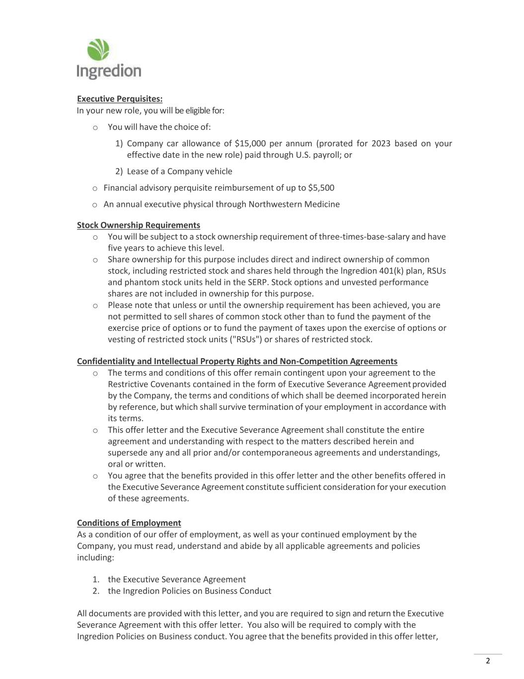 2 Executive Perquisites: In your new role, you will be eligible for: o You will have the choice of: 1) Company car allowance of $15,000 per annum (prorated for 2023 based on your effective date in the new role) paid through U.S. payroll; or 2) Lease of a Company vehicle o Financial advisory perquisite reimbursement of up to $5,500 o An annual executive physical through Northwestern Medicine Stock Ownership Requirements o You will be subject to a stock ownership requirement of three-times-base-salary and have five years to achieve this level. o Share ownership for this purpose includes direct and indirect ownership of common stock, including restricted stock and shares held through the lngredion 401(k) plan, RSUs and phantom stock units held in the SERP. Stock options and unvested performance shares are not included in ownership for this purpose. o Please note that unless or until the ownership requirement has been achieved, you are not permitted to sell shares of common stock other than to fund the payment of the exercise price of options or to fund the payment of taxes upon the exercise of options or vesting of restricted stock units ("RSUs") or shares of restricted stock. Confidentiality and Intellectual Property Rights and Non-Competition Agreements o The terms and conditions of this offer remain contingent upon your agreement to the Restrictive Covenants contained in the form of Executive Severance Agreement provided by the Company, the terms and conditions of which shall be deemed incorporated herein by reference, but which shall survive termination of your employment in accordance with its terms. o This offer letter and the Executive Severance Agreement shall constitute the entire agreement and understanding with respect to the matters described herein and supersede any and all prior and/or contemporaneous agreements and understandings, oral or written. o You agree that the benefits provided in this offer letter and the other benefits offered in the Executive Severance Agreement constitute sufficient consideration for your execution of these agreements. Conditions of Employment As a condition of our offer of employment, as well as your continued employment by the Company, you must read, understand and abide by all applicable agreements and policies including: 1. the Executive Severance Agreement 2. the Ingredion Policies on Business Conduct All documents are provided with this letter, and you are required to sign and return the Executive Severance Agreement with this offer letter. You also will be required to comply with the Ingredion Policies on Business conduct. You agree that the benefits provided in this offer letter,