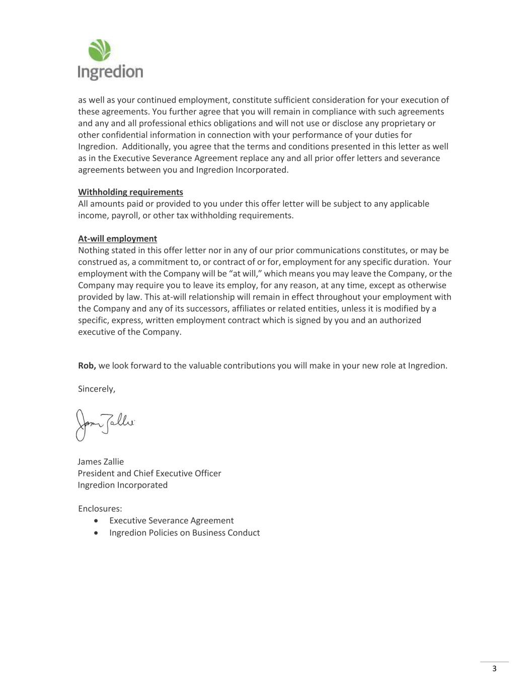 3 as well as your continued employment, constitute sufficient consideration for your execution of these agreements. You further agree that you will remain in compliance with such agreements and any and all professional ethics obligations and will not use or disclose any proprietary or other confidential information in connection with your performance of your duties for Ingredion. Additionally, you agree that the terms and conditions presented in this letter as well as in the Executive Severance Agreement replace any and all prior offer letters and severance agreements between you and Ingredion Incorporated. Withholding requirements All amounts paid or provided to you under this offer letter will be subject to any applicable income, payroll, or other tax withholding requirements. At-will employment Nothing stated in this offer letter nor in any of our prior communications constitutes, or may be construed as, a commitment to, or contract of or for, employment for any specific duration. Your employment with the Company will be “at will,” which means you may leave the Company, or the Company may require you to leave its employ, for any reason, at any time, except as otherwise provided by law. This at-will relationship will remain in effect throughout your employment with the Company and any of its successors, affiliates or related entities, unless it is modified by a specific, express, written employment contract which is signed by you and an authorized executive of the Company. Rob, we look forward to the valuable contributions you will make in your new role at Ingredion. Sincerely, James Zallie President and Chief Executive Officer Ingredion Incorporated Enclosures: • Executive Severance Agreement • Ingredion Policies on Business Conduct