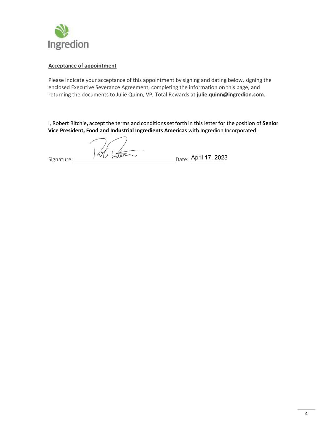 4 Acceptance of appointment Please indicate your acceptance of this appointment by signing and dating below, signing the enclosed Executive Severance Agreement, completing the information on this page, and returning the documents to Julie Quinn, VP, Total Rewards at julie.quinn@ingredion.com. I, Robert Ritchie, accept the terms and conditions set forth in this letter for the position of Senior Vice President, Food and Industrial Ingredients Americas with Ingredion Incorporated. Signature: Date: April 17, 2023