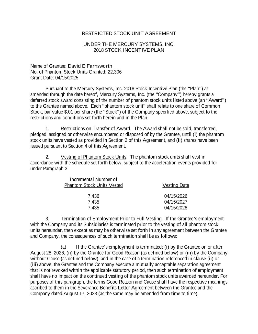 RESTRICTED STOCK UNIT AGREEMENT UNDER THE MERCURY SYSTEMS, INC. 2018 STOCK INCENTIVE PLAN Name of Grantee: David E Farnsworth No. of Phantom Stock Units Granted: 22,306 Grant Date: 04/15/2025 Pursuant to the Mercury Systems, Inc. 2018 Stock Incentive Plan (the “Plan”) as amended through the date hereof, Mercury Systems, Inc. (the “Company”) hereby grants a deferred stock award consisting of the number of phantom stock units listed above (an “Award”) to the Grantee named above. Each “phantom stock unit” shall relate to one share of Common Stock, par value $.01 per share (the “Stock”) of the Company specified above, subject to the restrictions and conditions set forth herein and in the Plan. 1. Restrictions on Transfer of Award. The Award shall not be sold, transferred, pledged, assigned or otherwise encumbered or disposed of by the Grantee, until (i) the phantom stock units have vested as provided in Section 2 of this Agreement, and (ii) shares have been issued pursuant to Section 4 of this Agreement. 2. Vesting of Phantom Stock Units. The phantom stock units shall vest in accordance with the schedule set forth below, subject to the acceleration events provided for under Paragraph 3. Incremental Number of Phantom Stock Units Vested Vesting Date 7,436 04/15/2026 7,435 04/15/2027 7,435 04/15/2028 3. Termination of Employment Prior to Full Vesting. If the Grantee’s employment with the Company and its Subsidiaries is terminated prior to the vesting of all phantom stock units hereunder, then except as may be otherwise set forth in any agreement between the Grantee and Company, the consequences of such termination shall be as follows: (a) If the Grantee’s employment is terminated: (i) by the Grantee on or after August 28, 2026, (ii) by the Grantee for Good Reason (as defined below) or (iii) by the Company without Cause (as defined below), and in the case of a termination referenced in clause (ii) or (iii) above, the Grantee and the Company execute a mutually acceptable separation agreement that is not revoked within the applicable statutory period, then such termination of employment shall have no impact on the continued vesting of the phantom stock units awarded hereunder. For purposes of this paragraph, the terms Good Reason and Cause shall have the respective meanings ascribed to them in the Severance Benefits Letter Agreement between the Grantee and the Company dated August 17, 2023 (as the same may be amended from time to time).