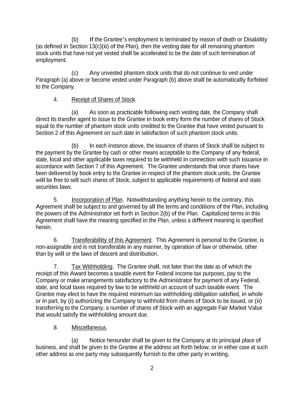 2 (b) If the Grantee’s employment is terminated by reason of death or Disability (as defined in Section 13(c)(ii) of the Plan), then the vesting date for all remaining phantom stock units that have not yet vested shall be accelerated to be the date of such termination of employment. (c) Any unvested phantom stock units that do not continue to vest under Paragraph (a) above or become vested under Paragraph (b) above shall be automatically forfeited to the Company. 4. Receipt of Shares of Stock. (a) As soon as practicable following each vesting date, the Company shall direct its transfer agent to issue to the Grantee in book entry form the number of shares of Stock equal to the number of phantom stock units credited to the Grantee that have vested pursuant to Section 2 of this Agreement on such date in satisfaction of such phantom stock units. (b) In each instance above, the issuance of shares of Stock shall be subject to the payment by the Grantee by cash or other means acceptable to the Company of any federal, state, local and other applicable taxes required to be withheld in connection with such issuance in accordance with Section 7 of this Agreement. The Grantee understands that once shares have been delivered by book entry to the Grantee in respect of the phantom stock units, the Grantee will be free to sell such shares of Stock, subject to applicable requirements of federal and state securities laws. 5. Incorporation of Plan. Notwithstanding anything herein to the contrary, this Agreement shall be subject to and governed by all the terms and conditions of the Plan, including the powers of the Administrator set forth in Section 2(b) of the Plan. Capitalized terms in this Agreement shall have the meaning specified in the Plan, unless a different meaning is specified herein. 6. Transferability of this Agreement. This Agreement is personal to the Grantee, is non-assignable and is not transferable in any manner, by operation of law or otherwise, other than by will or the laws of descent and distribution. 7. Tax Withholding. The Grantee shall, not later than the date as of which the receipt of this Award becomes a taxable event for Federal income tax purposes, pay to the Company or make arrangements satisfactory to the Administrator for payment of any Federal, state, and local taxes required by law to be withheld on account of such taxable event. The Grantee may elect to have the required minimum tax withholding obligation satisfied, in whole or in part, by (i) authorizing the Company to withhold from shares of Stock to be issued, or (ii) transferring to the Company, a number of shares of Stock with an aggregate Fair Market Value that would satisfy the withholding amount due. 8. Miscellaneous. (a) Notice hereunder shall be given to the Company at its principal place of business, and shall be given to the Grantee at the address set forth below, or in either case at such other address as one party may subsequently furnish to the other party in writing.