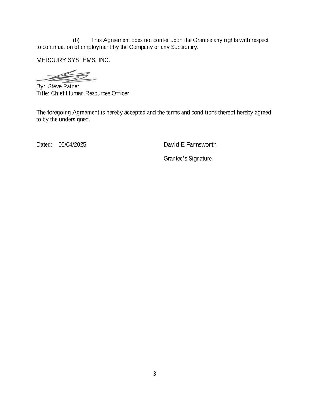 3 (b) This Agreement does not confer upon the Grantee any rights with respect to continuation of employment by the Company or any Subsidiary. MERCURY SYSTEMS, INC. By: Steve Ratner Title: Chief Human Resources Officer The foregoing Agreement is hereby accepted and the terms and conditions thereof hereby agreed to by the undersigned. Dated: 05/04/2025 David E Farnsworth Grantee’s Signature