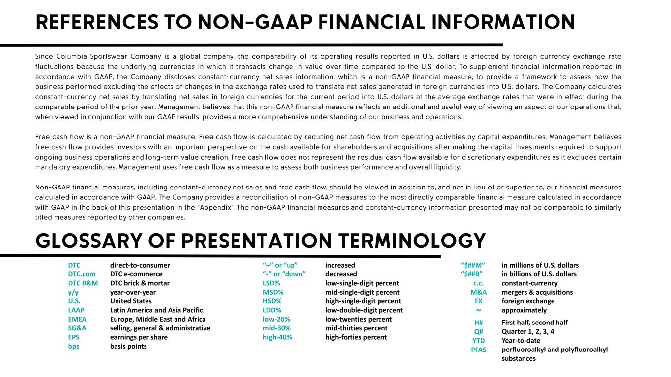 Since Columbia Sportswear Company is a global company, the comparability of its operating results reported in United States dollars is affected by foreign currency exchange rate fluctuations because the underlying currencies in which it transacts change in value over time compared to the United States dollar. To supplement financial information reported in accordance with GAAP, the Company discloses constant-currency net sales information, which is a non-GAAP financial measure, to provide a framework to assess how the business performed excluding the effects of changes in the exchange rates used to translate net sales generated in foreign currencies into United States dollars. The Company calculates constant-currency net sales by translating net sales in foreign currencies for the current period into United States dollars at the average exchange rates that were in effect during the comparable period of the prior year. Management believes that this non-GAAP financial measure reflects an additional and useful way of viewing an aspect of our operations that, when viewed in conjunction with our GAAP results, provides a more comprehensive understanding of our business and operations. In particular, investors may find the non-GAAP financial measure useful by reviewing our net sales results without the volatility in foreign currency exchange rates. This non-GAAP financial measure also facilitates management's internal comparisons to our historical net sales results and comparisons to competitors' net sales results.