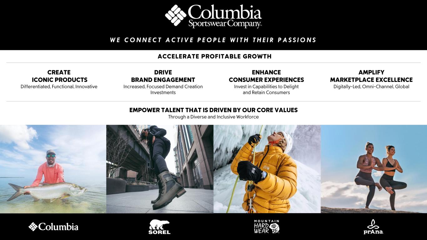Columbia Sportswear Company connects active people with their passions and is a global multi-brand leading innovator in outdoor, active and lifestyle products including apparel, footwear, accessories, and equipment. Founded in 1938 in Portland, Oregon, the Company's brands are sold in more than 100 countries. In addition to the Columbia® brand, Columbia Sportswear Company also owns the Mountain Hard Wear®, SOREL® and prAna® brands. To learn more, please visit the Company's websites at www.columbia.com, www.mountainhardwear.com, www.sorel.com, and www.prana.com.
