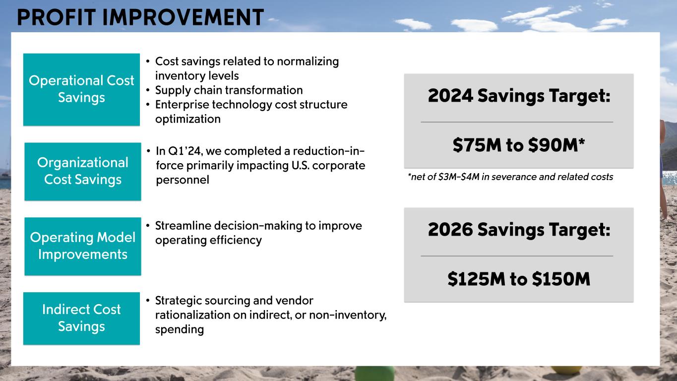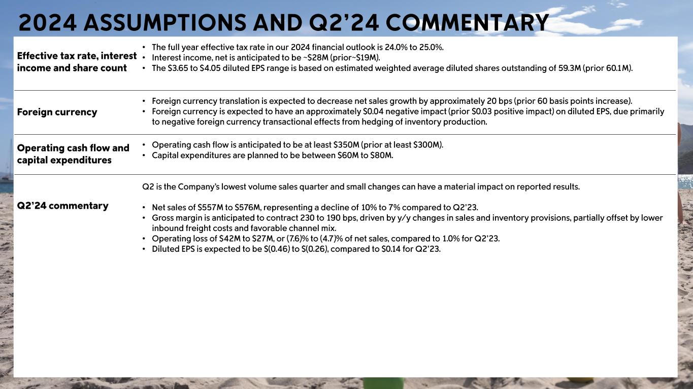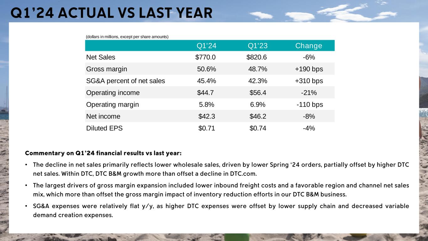 Chairman, President and Chief Executive Officer Tim Boyle commented, “2024 has started out broadly in line with our expectations. We are making good progress against our top priorities. Inventory exiting the quarter was down 37 percent year-over-year, and our Profit Improvement Plan is on track to achieve our savings targets. Based on year-to-date results, we are reiterating our net sales outlook while modestly increasing our diluted EPS range.