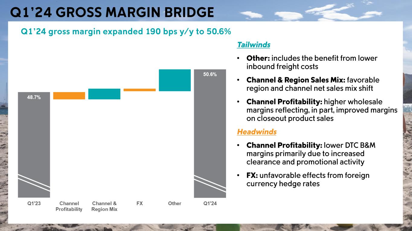 Gross margin increased 190 basis points to 50.6 percent of sales compared to 48.7 percent of net sales for the comparable period in 2023. Gross margin expansion primarily reflects lower inbound freight costs and favorable region and channel net sales mix, which more than offset the gross margin impact of inventory reduction efforts in our direct-to-consumer ("DTC") brick and mortar business.