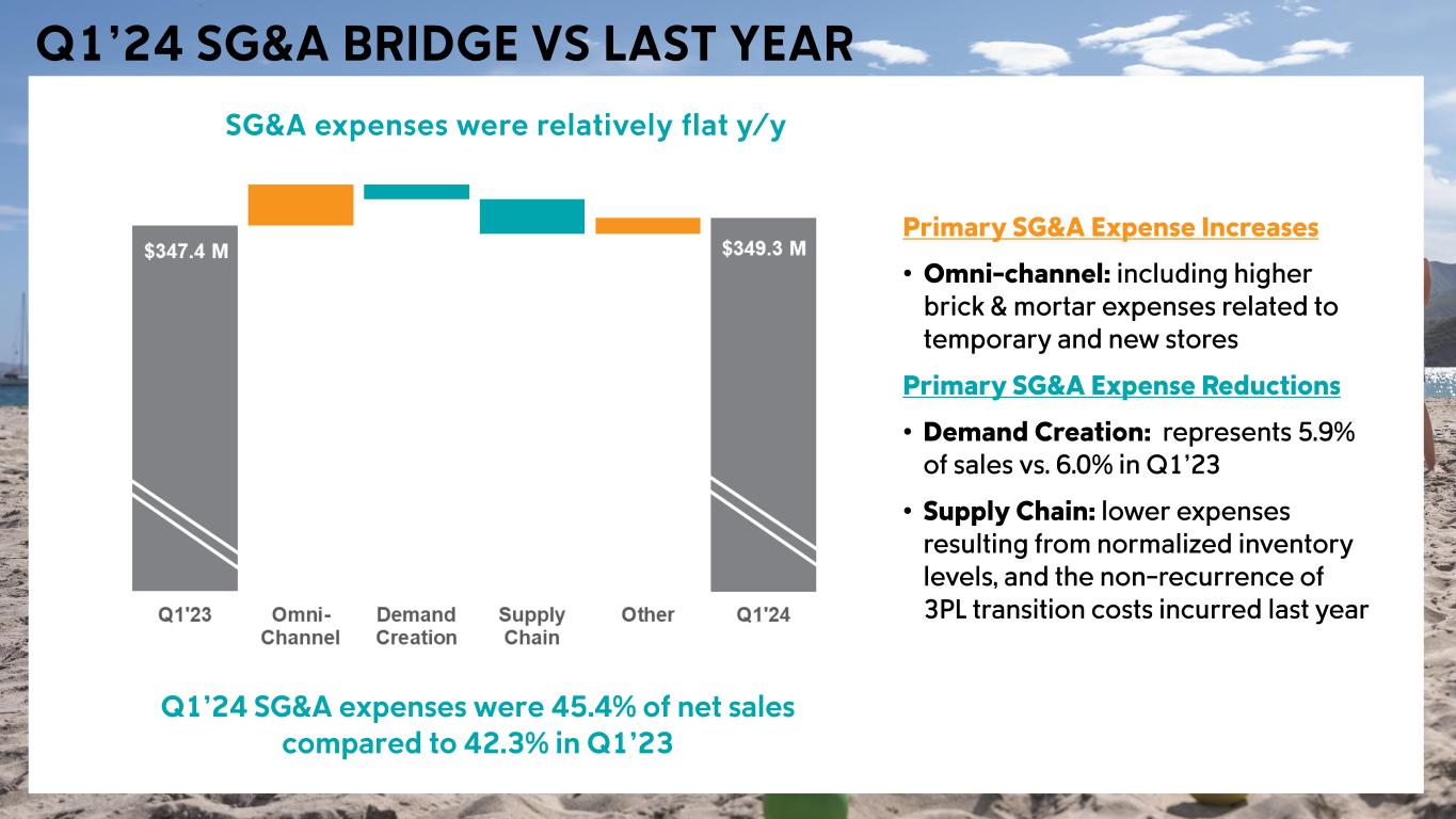 SG&A expenses were relatively flat at $349.3 million, or 45.4 percent of net sales, compared to $347.4 million, or 42.3 percent of net sales, for the comparable period in 2023. The largest changes in SG&A expenses primarily reflect higher DTC expenses, partially offset by lower supply chain costs and decreased variable demand creation expenses.