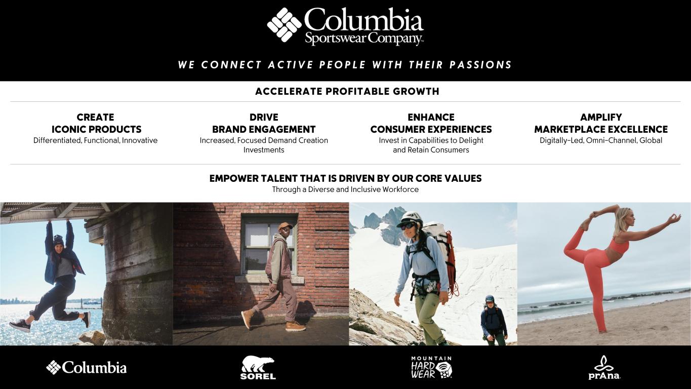 ACCELERATE(アクセレイト)」は、コロンビア・ブランドを高め、より若く活動的な消費者を惹きつけることを目的とした成長戦略です。これは、ブランド戦略、製品戦略、市場戦略、働き方の強化など、消費者中心のいくつかの転換を中心とした複数年にわたる取り組みである。ACCELERATE成長戦略の詳細については、CFOコメンタリーおよび財務レビューをご参照ください。