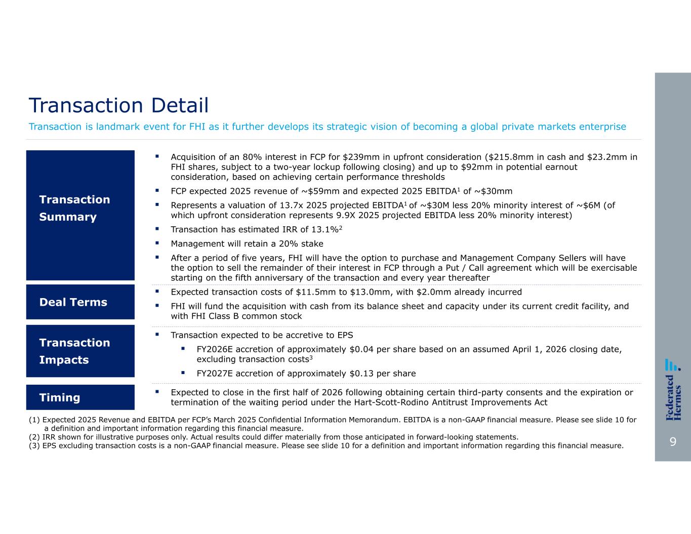 Schedule 9.4 Sample Working Capital Calculation This SALE AND PURCHASE AGREEMENT (this “Agreement”), dated as of October 23, 2025, is entered into by and among Federated Hermes, Inc., a Pennsylvania corporation (“Buyer”), the parties identified as the Management Company Sellers on Exhibit A hereto (each a “Management Company Seller” and collectively, as applicable, the “Management Company Sellers”), the parties identified as the Selling Principals on Exhibit A hereto (each a “Selling Principal” and collectively, as applicable, the “Selling Principals”), FCP Fund Manager, L.P., a Delaware limited partnership (“Company”), and FCP Seller Rep LLC, a Delaware limited liability company, solely in its capacity as the representative of the Selling Principals and the Management Company Sellers (the “Management Company Sellers’ Representative”). Each of Buyer, the Management Company Sellers, the Selling Principals, Company and the Management Company Sellers’ Representative is sometimes referred to individually in this Agreement as a “Party” and collectively, as applicable, as the “Parties.” Capitalized terms used in this Agreement and not otherwise defined have the meanings specified in Section 9.1.