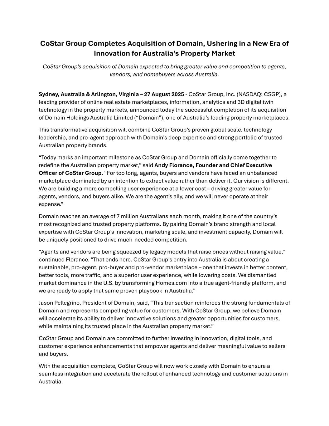 EX-99.1 2 costargroupcompletesacqu.htm EX-99.1 costargroupcompletesacqu