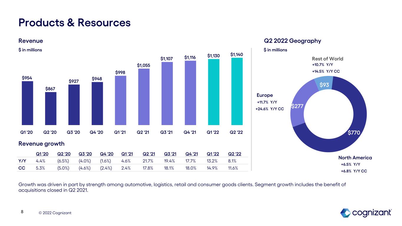 Products and Resources revenue grew 8.1% year-over-year, or 11.6% in constant currency, driven in part by strength among automotive, logistics, retail and consumer goods clients. Segment growth includes the benefit of acquisitions closed in Q2 2021.
