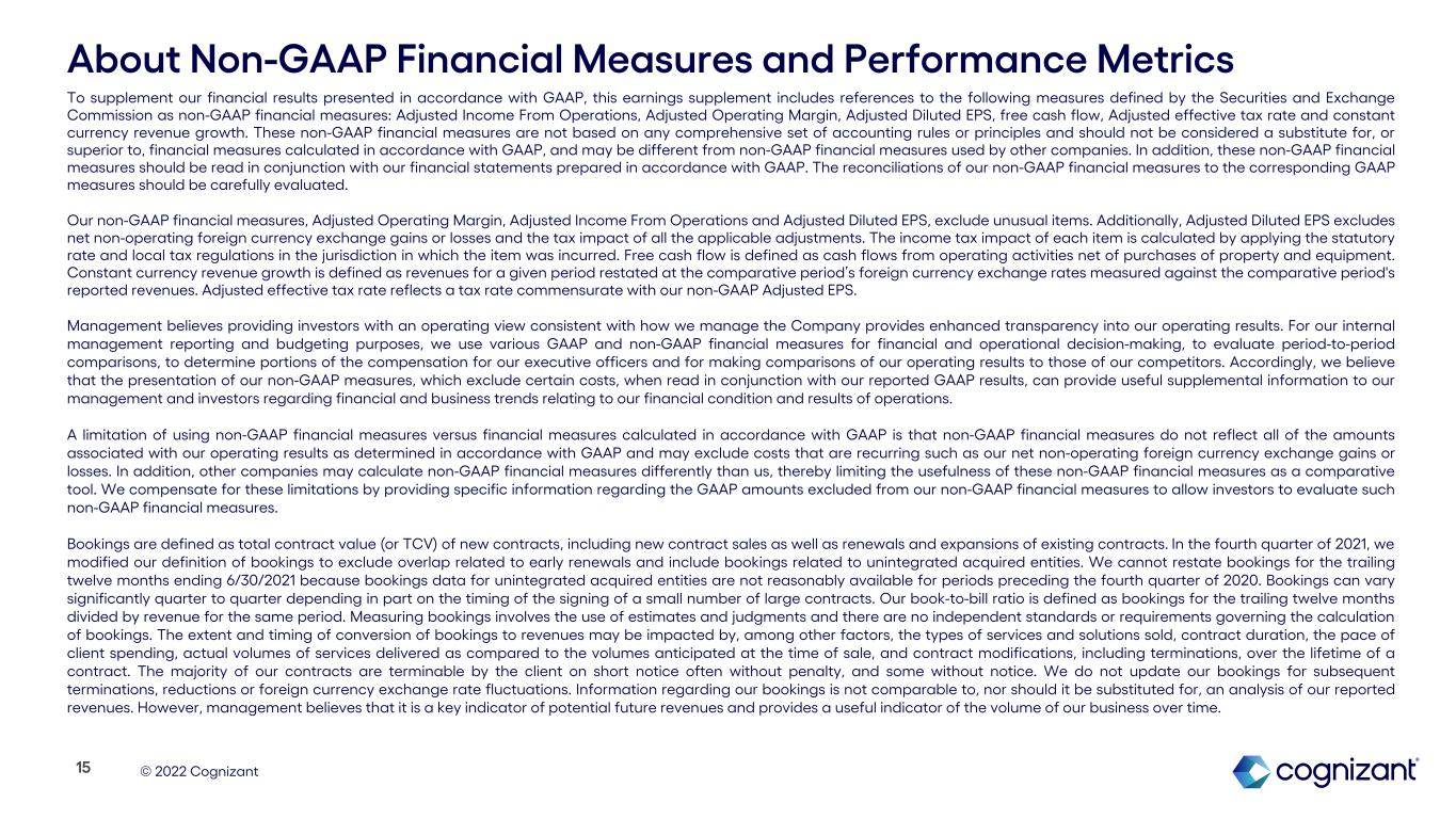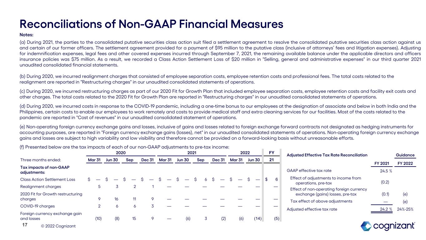 This press release includes statements that may constitute forward-looking statements made pursuant to the safe harbor provisions of the Private Securities Litigation Reform Act of 1995, the accuracy of which are necessarily subject to risks, uncertainties, and assumptions as to future events that may not prove to be accurate. These statements include, but are not limited to, express or implied forward-looking statements relating to our expectations regarding the impact of the COVID-19 pandemic on our business, our strategy, competitive position and opportunities in the marketplace, investment in and growth of our business, the effectiveness of our recruiting and talent efforts and related costs, trends in demand for digital solutions and services, labor market trends, the anticipated amount of capital to be returned to shareholders and our anticipated financial performance. These statements are neither promises nor guarantees, but are subject to a variety of risks and uncertainties, many of which are beyond our control, which could cause actual results to differ materially from those contemplated in these forward-looking statements. Existing and prospective investors are cautioned not to place undue reliance on these forward-looking statements, which speak only as of the date hereof. Factors that could cause actual results to differ materially from those expressed or implied include general economic conditions, the competitive and rapidly changing nature of the markets we compete in, the competitive marketplace for talent and its impact on employee recruitment and retention, legal, reputational and financial risks resulting from cyberattacks, the impact of and effectiveness of business continuity plans during the COVID-19 pandemic, risks related to the invasion of Ukraine by Russia, changes in the regulatory environment, including with respect to immigration and taxes, and the other factors discussed in our most recent Annual Report on Form 10-K and other filings with the Securities and Exchange Commission. Cognizant undertakes no obligation to update or revise any forward-looking statements, whether as a result of new information, future events, or otherwise, except as may be required under applicable securities law.